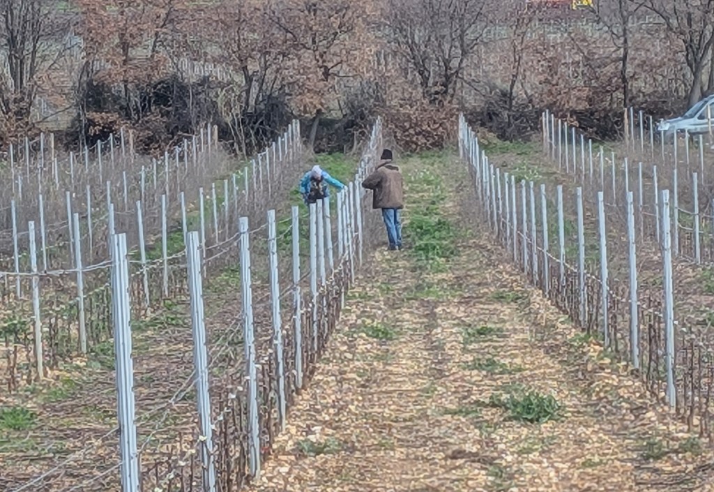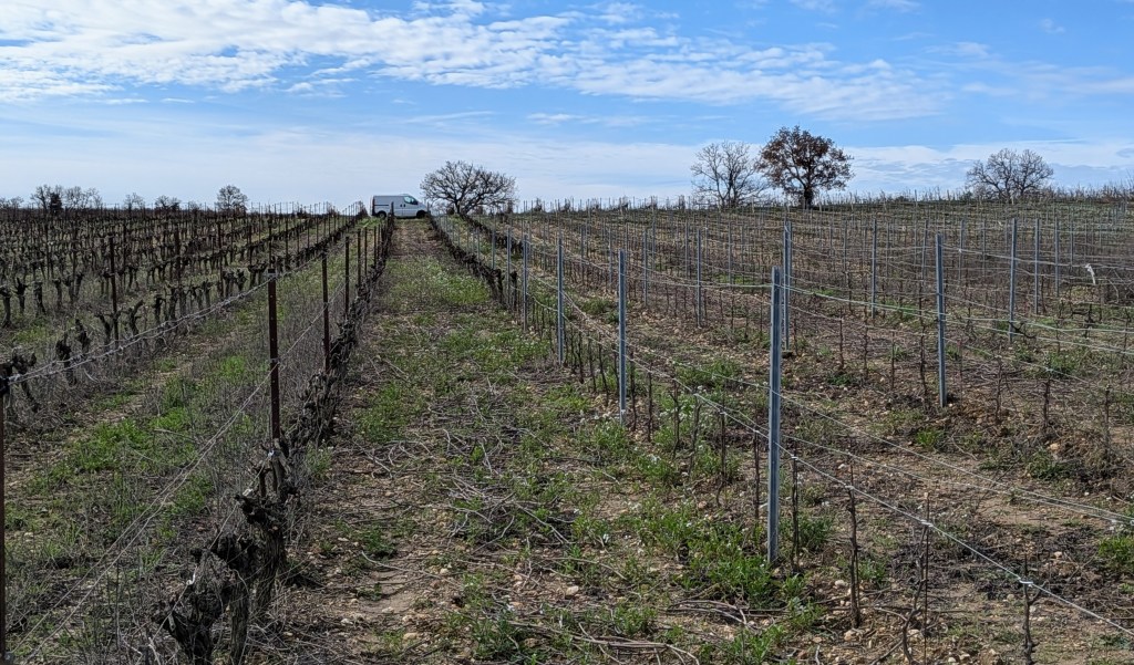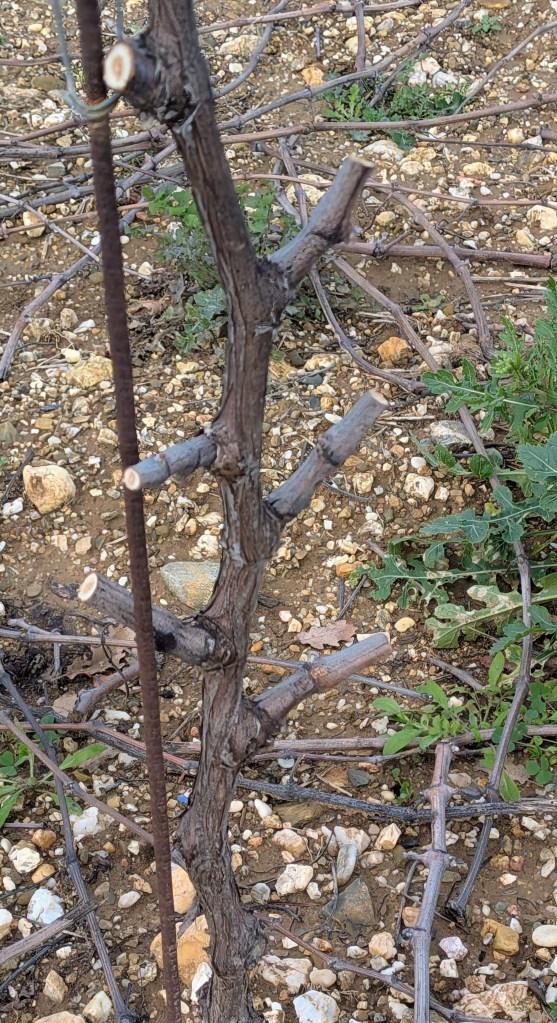 After a brief chat with Jeff Coutelou on Thursday I went out into La Garrigue vineyard to see Flora and Gilles who were busy pruning the new plantation of Syrah. All good at first but, after popping down to the bottom of the vineyard to see the ditch which is currently a stream, the walk back up left me sinking into mud and shoes being pulled off feet as the soaked earth claimed them. Anyway it was good to see everyone and enjoy being back amongst the dormant vines, some sporting their new cuts. The contrast was transparent between the young plantation and older Syrah vines of La Garrigue which, in good vintages, make my favourite wine, La Vigne Haute.