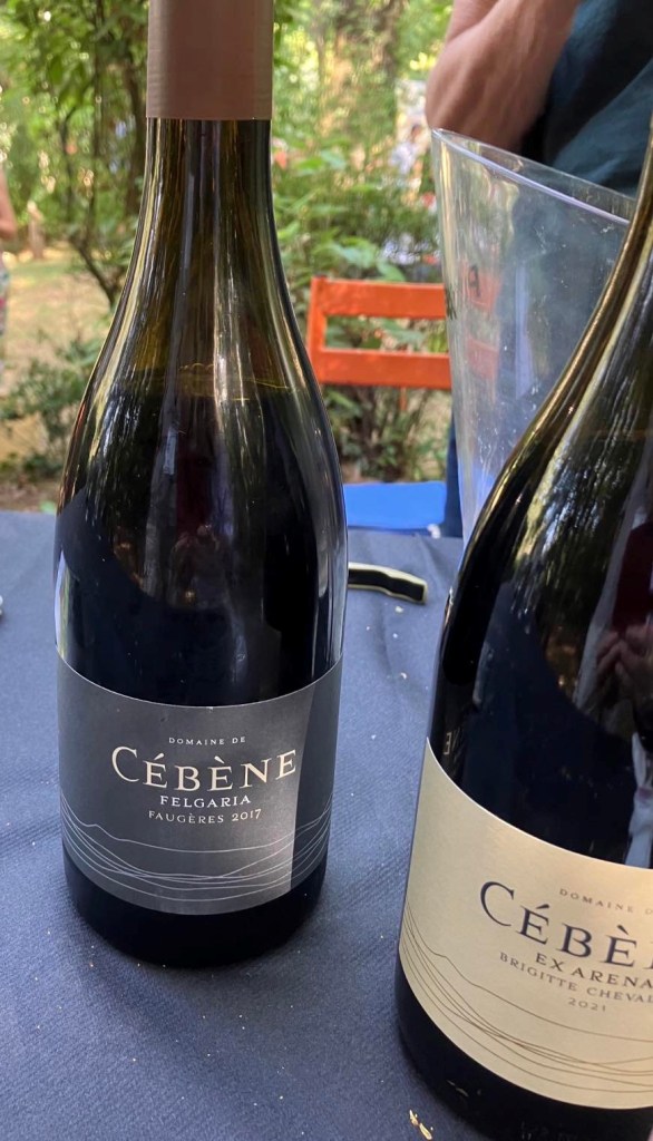 Finally to Domaine de Cébène. Regular readers know that this is one of my favourite wine domaines anywhere, run by the exceptional Brigitte Chevalier and about whom I wrote last year here. It was good to catch up with Brigitte again, taste new vintages and chat. I won’t add much to what I wrote last year, the domaine is organic and biodynamic, based high in the hills between Faugères and Caussiniojouls. Brigitte has transformed and revived old vineyards as well as adding new plantings. Praised by Jancis Robinson and many others, I can only agree. A La Venvole 20 is the newish addition (2nd vintage) designed to be lighter and easier drinking and successfully achieves its goal without compromising on quality. Ex Arena 21 made from Grenache primarily and from outside the Faugères area, hence its name and IGP status. Very low yields but an elegant, savoury wine, complexity too and the most beautiful aromas swirling in the glass.