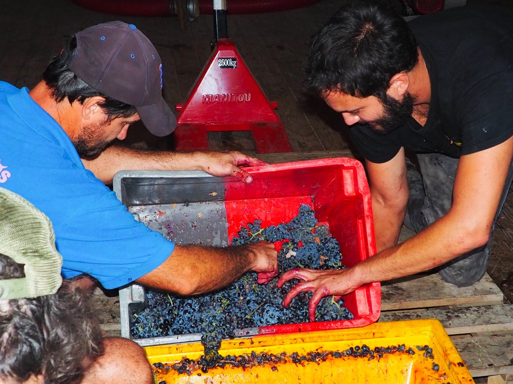 The final day of my truncated vendanges this year was Friday September 9th. The Carignan of Rec D’Oulette, which I described in the last post, needed to be completed in the morning and this was to be followed by Carignan again, this time from Peilhan. The quality of the grapes there tends to be good without the absolute quality of the former. Jeff wanted some Carignan for blending and to add some fruit profile to those blends so we were going to be doing whole bunch semi-carbonic maceration. There was also a slight time pressure that afternoon as the Moroccan pickers were finishing that day as well as Tony, Marco, Boris and Manu. Consequently, we worked late finishing the parcel, sorting and cleaning by 7.45 that evening.