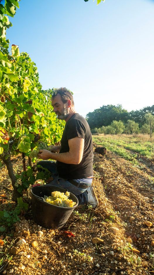 A few days later Jeff was keen to bottle a few hundred bottles of Bibonade, his PetNat made with almost fermented grapes from this year’s vintage. Some of the white juice I described in the last post such as Aramon Blanc and Olivette were fermenting very quickly so Jeff, Matteo, Flora and Gilles went to pick some Grenache Blanc, there is just one row in La Garrigue and it had been left in case it was needed for such a role. The juice was put into a basket press and added to slow the fermentation. Fortunately, Flora was able to take some photos too.
