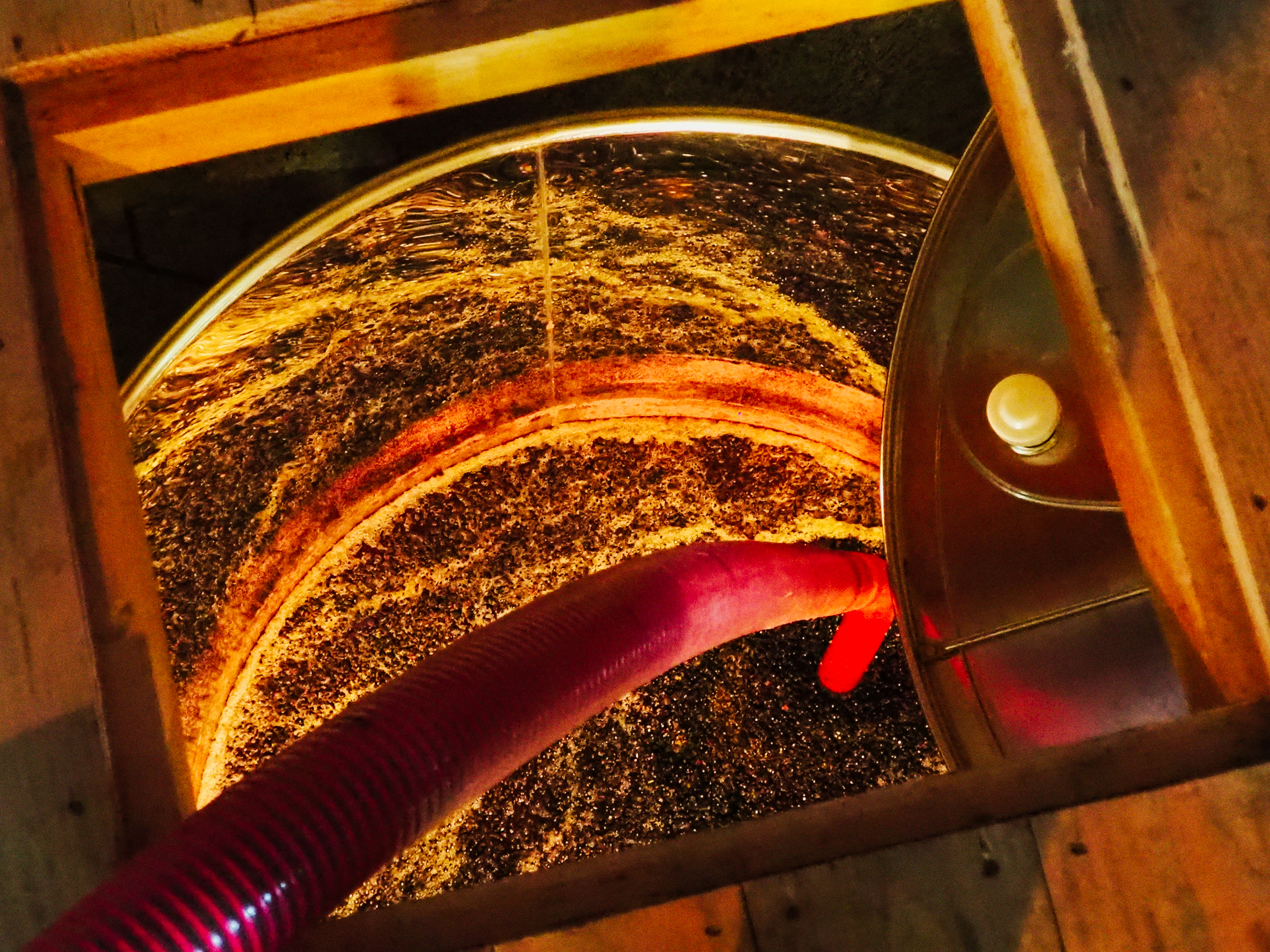 It is slower to sort like this as you are bent over the hatch into the cuve and have to go through each bunch picking them out one by one. The space is limited and muscles become sore quickly. Matteo and I did most of the sorting whilst the others went to help the Moroccans complete the picking. It was a case of déja vu as Matteo reminded me that we did the same job with the same parcel last year. The grapes fall directly into the cuve through the yellow chute and the large cuve was pretty full by the time we completed our work, a good example of vendanges 22 in that there was the quantity as well as quality. Jeff smiled despite the three weeks of worry and stress with more to come as the cellar work continues.