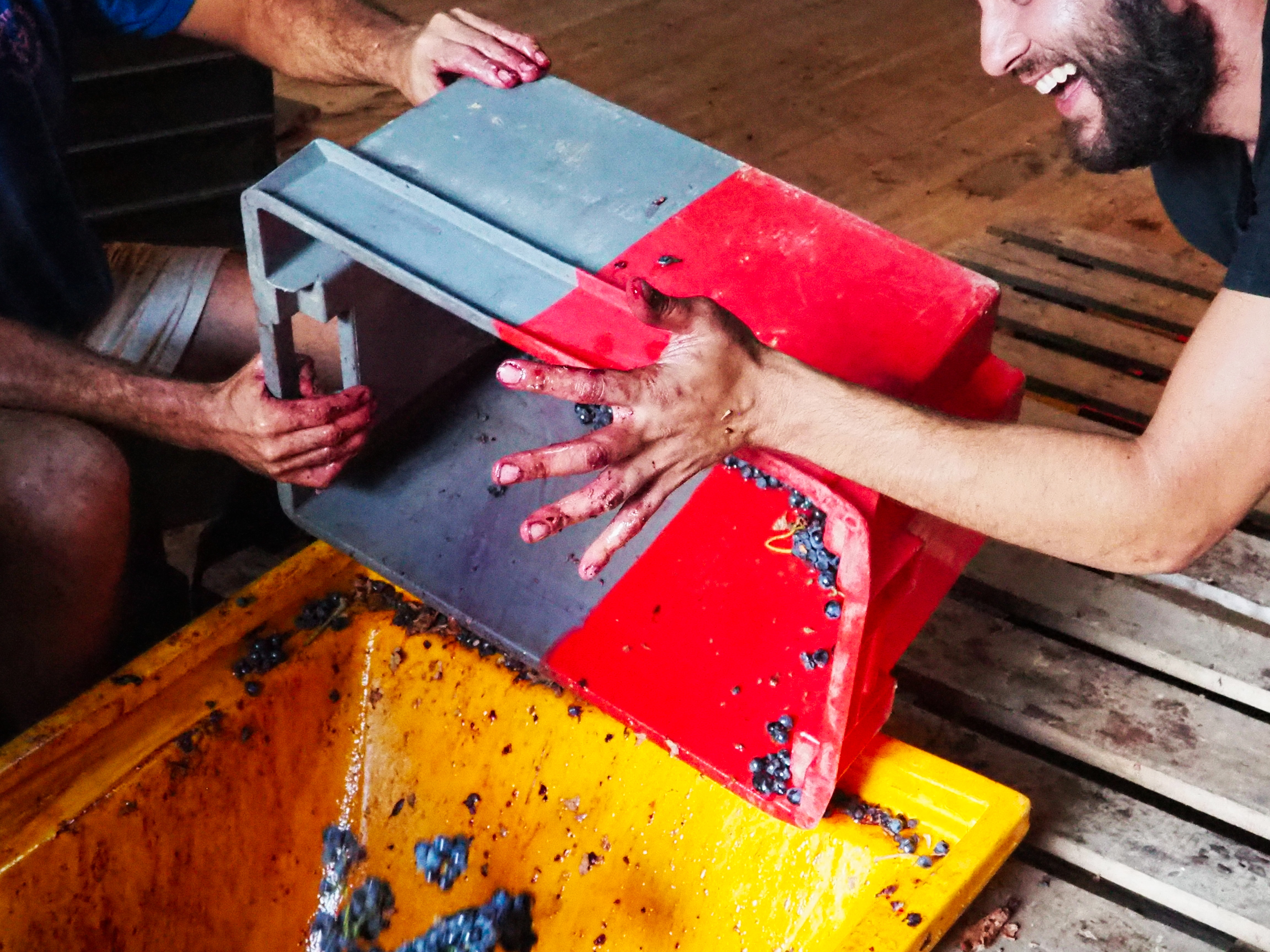 The final day of my truncated vendanges this year was Friday September 9th. The Carignan of Rec D’Oulette, which I described in the last post, needed to be completed in the morning and this was to be followed by Carignan again, this time from Peilhan. The quality of the grapes there tends to be good without the absolute quality of the former. Jeff wanted some Carignan for blending and to add some fruit profile to those blends so we were going to be doing whole bunch semi-carbonic maceration. There was also a slight time pressure that afternoon as the Moroccan pickers were finishing that day as well as Tony, Marco, Boris and Manu. Consequently, we worked late finishing the parcel, sorting and cleaning by 7.45 that evening.