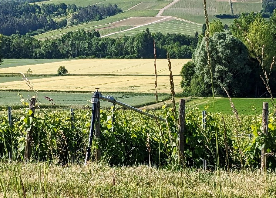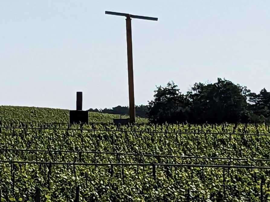 It was interesting to see the infrastructure used in the region to combat the frost risk after years of damage. Windmills to keep air moving around the vines are dotted around the hillsides but even more noticeable are the pipes. These are not meant for irrigating the vines but to spray water over the vines when there is a Spring frost to protect the buds. Water freezing releases heat, 1 gram of water produces 80 calories and this small amount of heat keeps the plant safe.