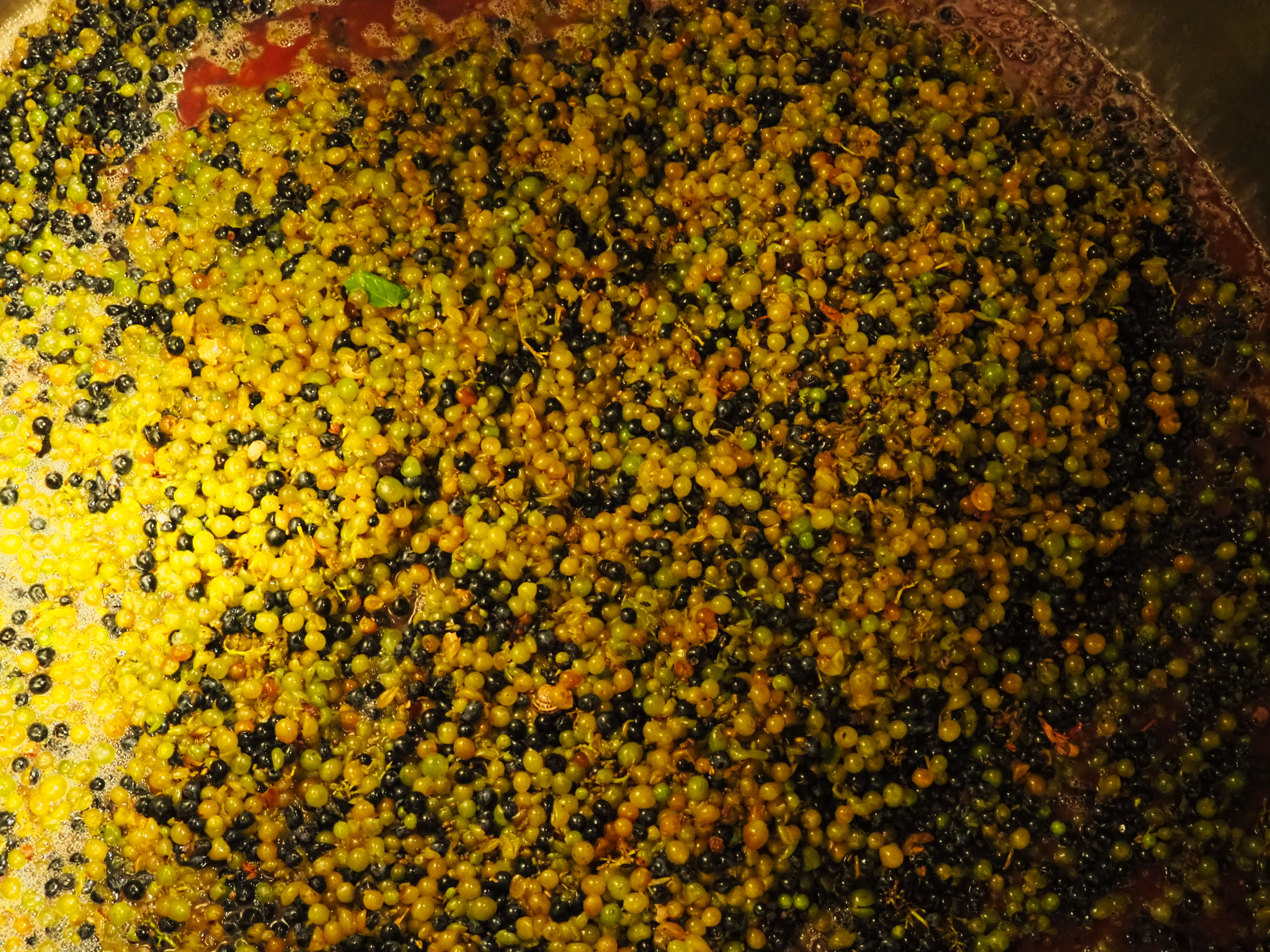 The grapes are very healthy, the drought has at least prevented any mildew or oidium. Sorting the red grapes was straightforward, mainly removing leaves and snails. The snails have clearly been seeking any moisture in the parched landscape and they clung to the grapes in desperation. After destemming the grapes were sorted a second time to remove any stalks or leaves which has made their way through. They were then put into small stainless steel tanks, three were filled and Jeff was reasonably content with the quantity, fairly typical yields despite the small grapes.