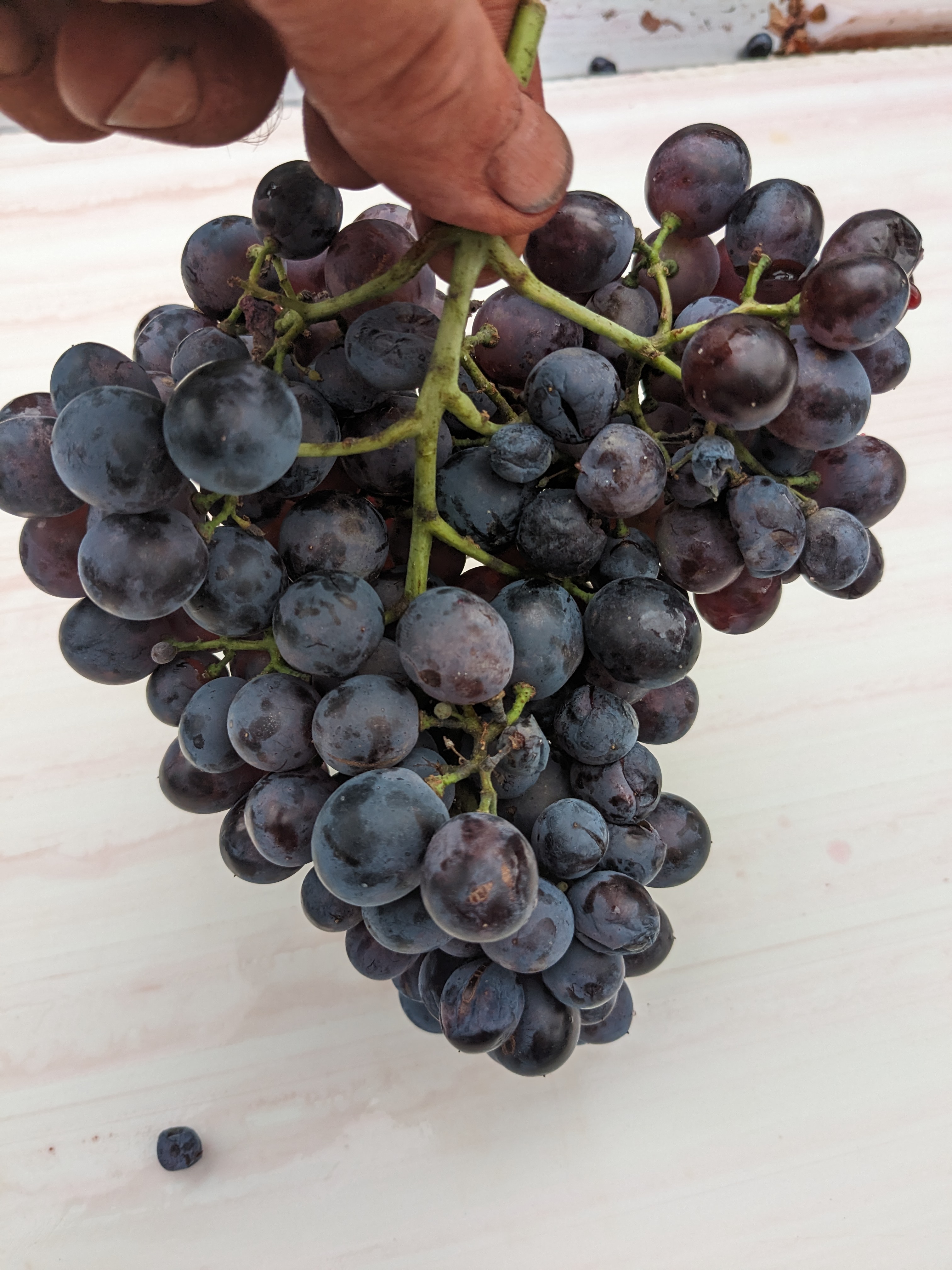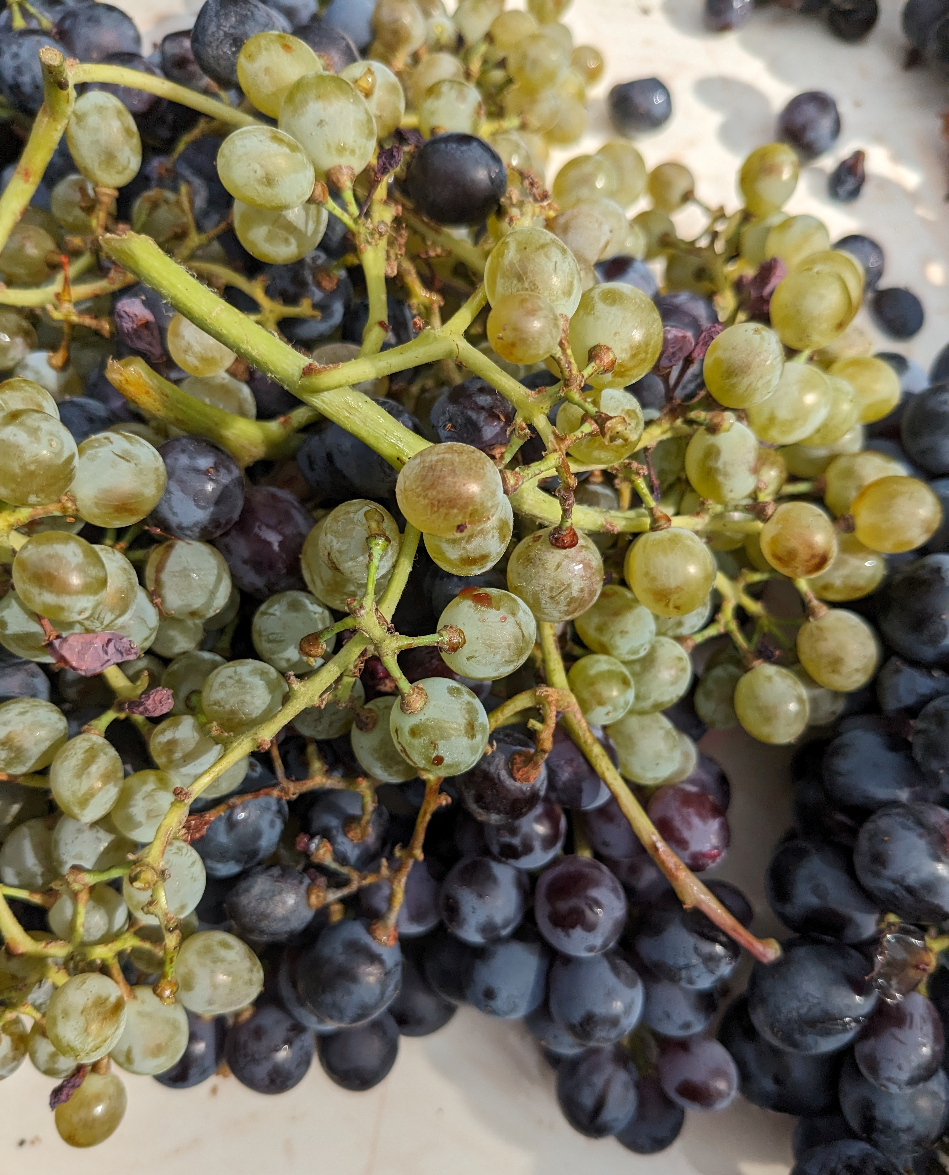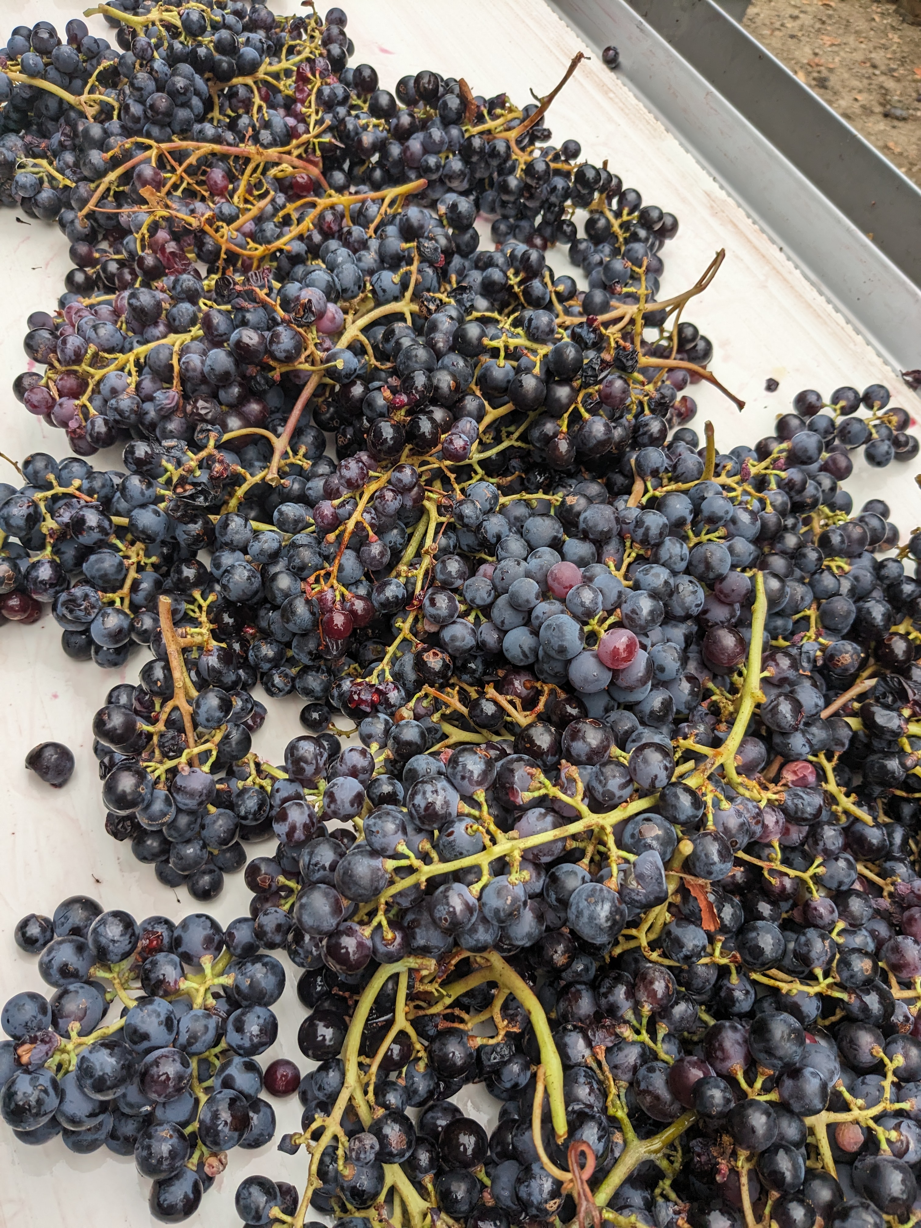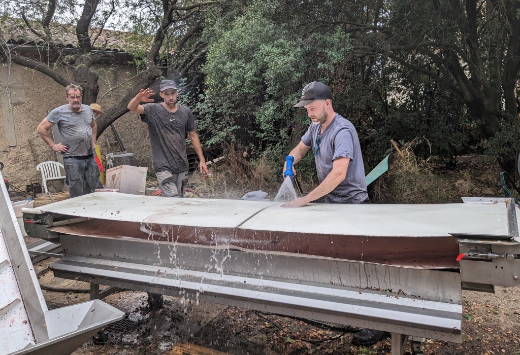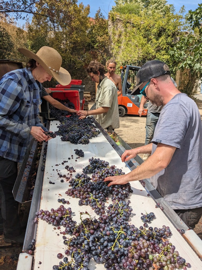 Fortunately, Jeff got the decision just right. Whilst there were some affected bunches, we were able to deal with them at the sorting table. The Cinsault was as good quality as I can recall and the size of the bunches and grapes meant that the cases came thick and fast to us from the vineyard. In addition there arrived Mauzac and Aramon Gris, both had to be scrutinised for small amounts of oidium – the first disease of the harvest but, happily, affecting just a tiny percentage of the grapes. Perhaps the most striking grapes though were the Aramon Noir, the stems a nice contrast to the very black grapes in very good health. Aramon, of course, was once widely planted in the region and used for producing huge quantities of low alcohol, cheap wine. The vast majority has been grubbed up but there has been a recent renaissance with producers such as Jeff aiming for low yields of fruity grapes. The blending of these grapes will make Ploutelou, the third vintage of this cuvée, the Coutelou homage to the Jura’s Ploussard, which itself has thin, dark skins producing a lightish, fruity wine. Ploutelou has been a big success and this year’s ought to be very good.