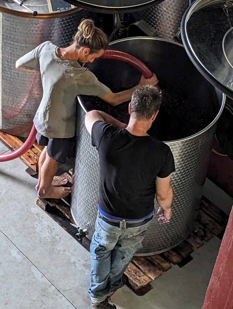 It was a good day, hard work, the team working well together. A new addition was Andrew form Australia. He works for James Madden in the Adelaide Hills at Scintilla Wines. James, of course, came to do harvest with Jeff in 2016 and, so, the link continues. He is an experienced worker and, after mostly getting over his jet lag, he was busy at the sorting table and then doing a remontage as the cellar work builds with increasing amounts of grapes to care for. We were certainly weary by 6pm on Saturday but happy that Jeff has plenty of promising wines ahead.