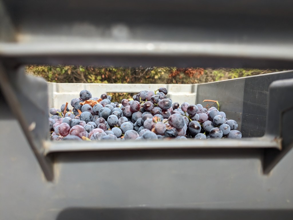 The largest area of the vineyard is Cinsault and it has to be picked at a Goldilocks moment, not too late, not too soon, not too ripe but just right. It can be healthy and very juicy one day and then mushy the next day. Its thin skins make it prone to rot and easy for the cryptoblabes / honeydew moths to access as the bunches and grapes are large with space for the moths to get into to lay eggs. Jeff had noticed that this new variety of grape worm which I wrote about earlier this year was starting to show. They become active when the grapes are ripe with good sugars, exactly the situation in the Cinsault.