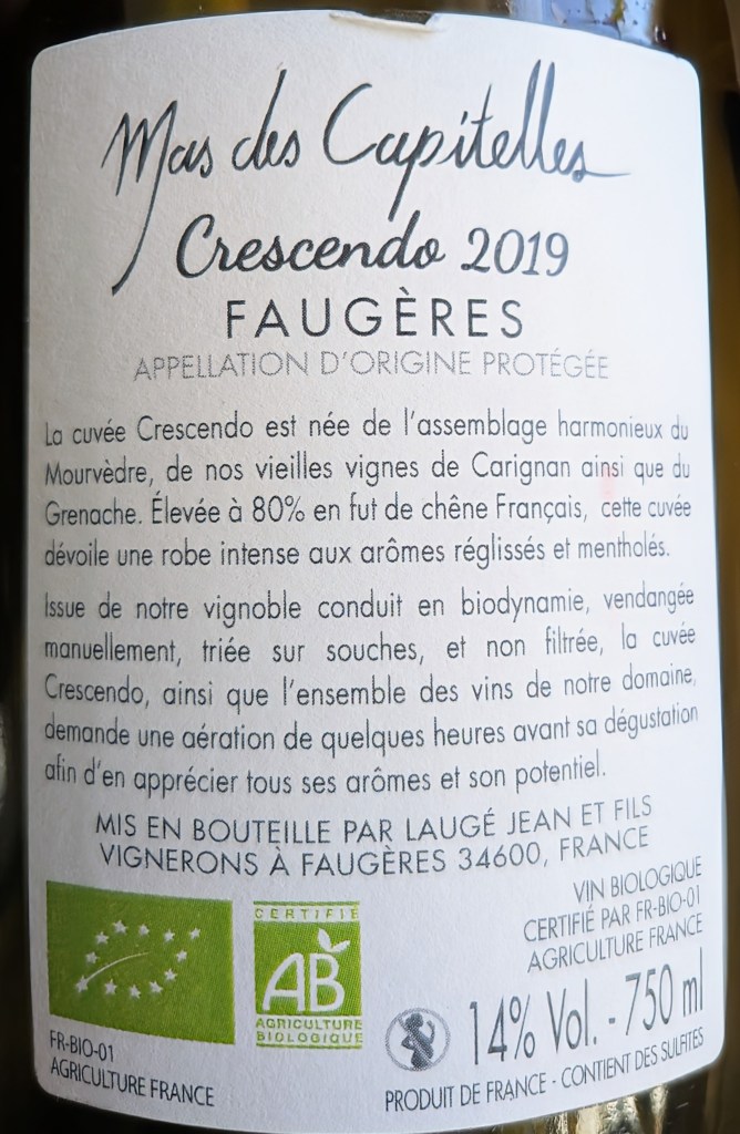A few kilometres up the road is another favourite estate, Mas Des Capitelles. They work biodynamically and make full red wines largely based on Carignan and Grenache and they age the wines for a few years before they are released. Crescendo 2019 is made up of Mourvèdre, old Carignan and some Grenache. One of those bottles which changed with every glass, practically every mouthful. Dark fruits, tannins and balance. Lovely.