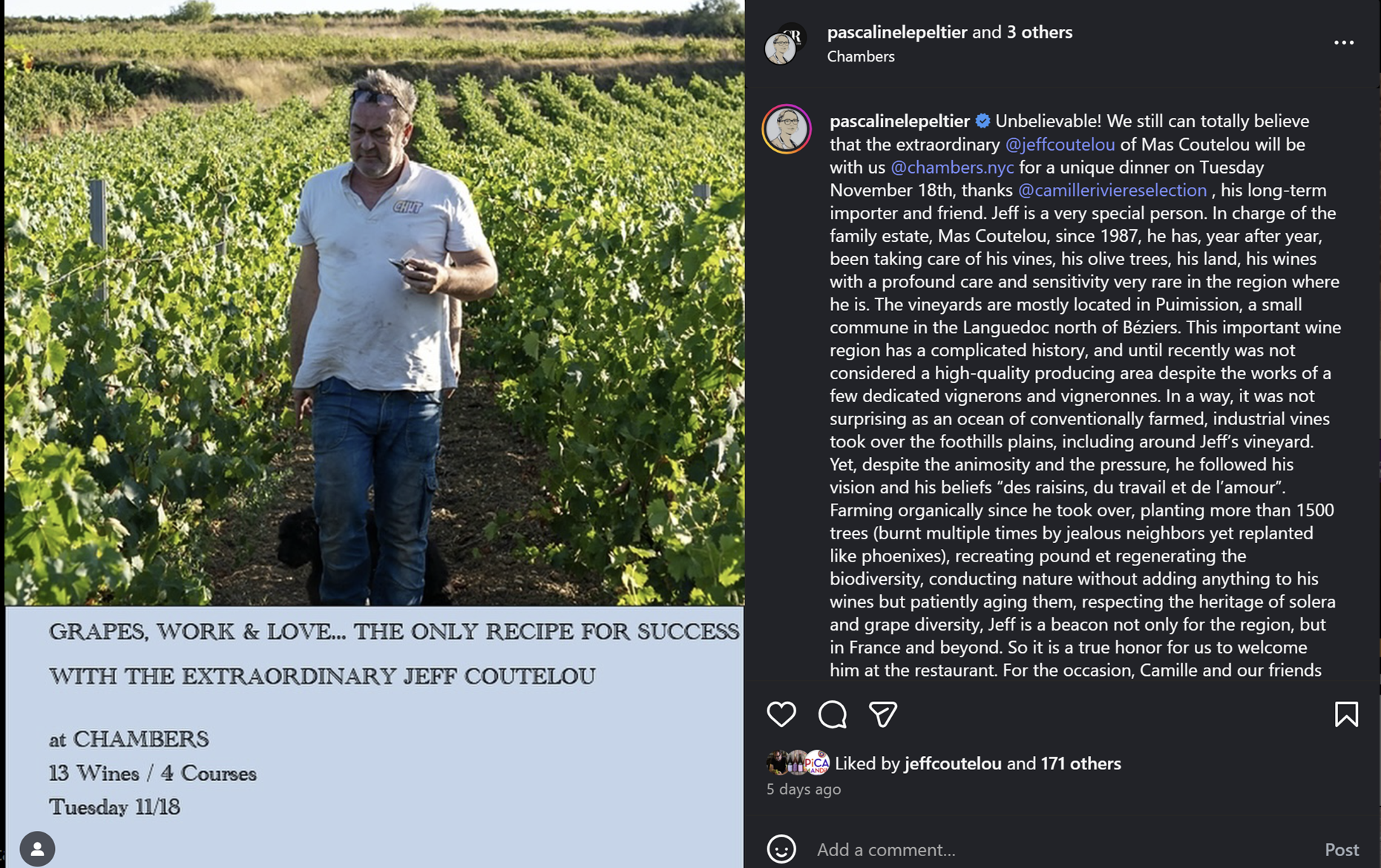 English (and Welsh) wines made a big impression on me in 2025. I have enjoyed a fair number in the past from producers such as Davenport and Westwell but this year I was able to enjoy more examples and I think that the quality is rising at a serious pace. My favourite bottle is one I have described here a number of times, Mountain People‘s TAM 2023, a Chardonnay made in Wales by the excellent David Morris. Actually produced from grapes grown in Somerset this would easily rival many a top Jura wine. I had a few bottles through the year including this one shared with Jeff Coutelou (background left) who liked it a lot.