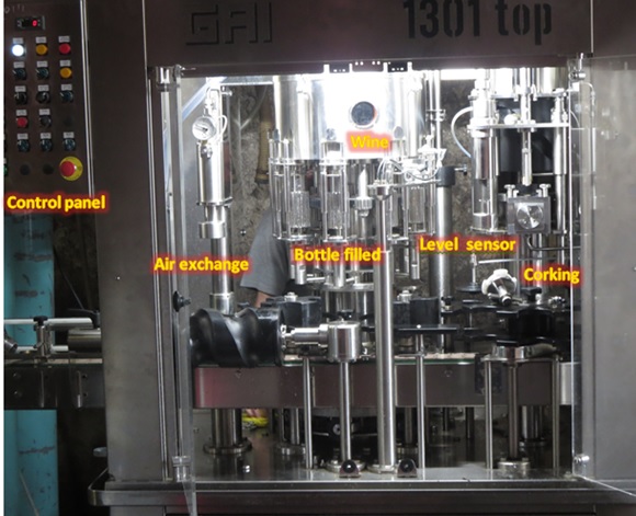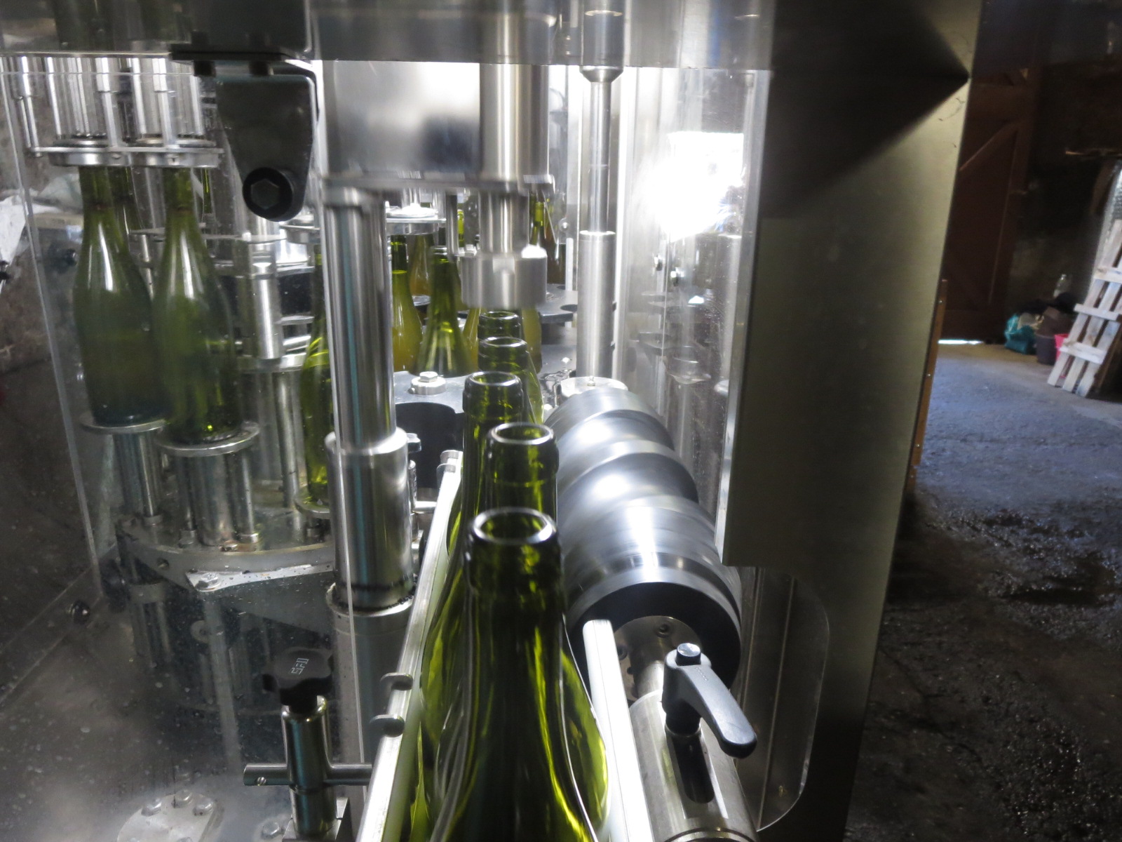 The next day the new part was fitted and the main bottling line was in action. This is an expensive machine but can bottle 1200 bottles an hour whilst controlling the risks of contamination and exposure to oxygen. Carole can be seen here placing the bottles on the machine. It then carries the bottles through the process at the required speed.