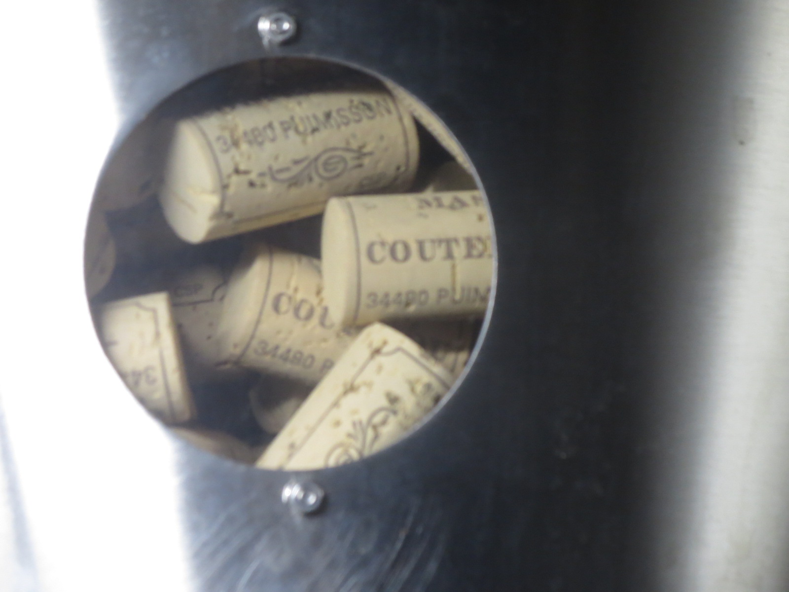 Inside the main body of the machine the bottle has its air sucked out to prevent any staleness. The bottle passes to the reservoir of wine and is filled. It moves on to a sensor to ensure that the level is correct inside the bottle, and removes or adds wine as necessary.It is important that there is a small gap between wine and cork to allow air inside so that the wine can breathe and develop before consumption. The cork is then driven into the bottle which begins a 3 minute journey around a conveyor belt allowing the cork to expand in the bottle neck so that is properly closed. They do rather resemble penguins waddling or a long queue in the Post Office.