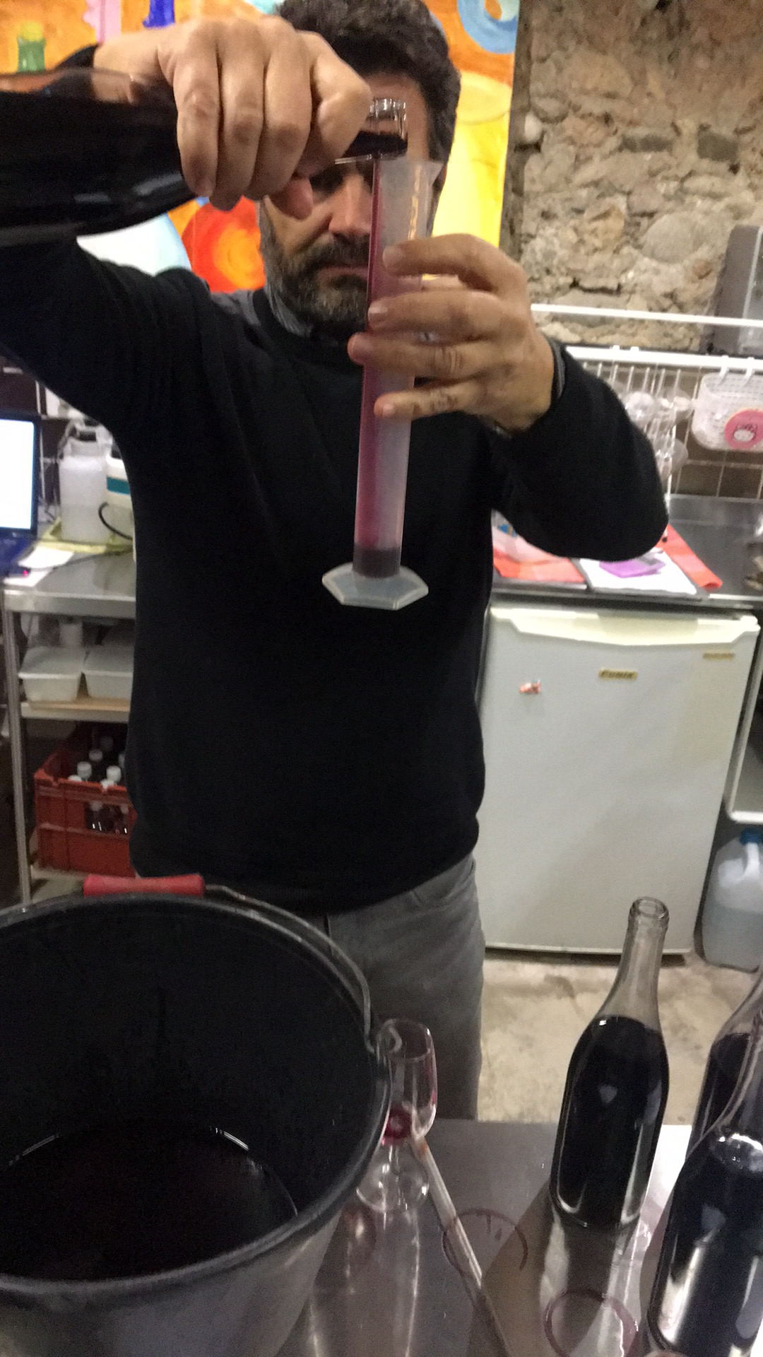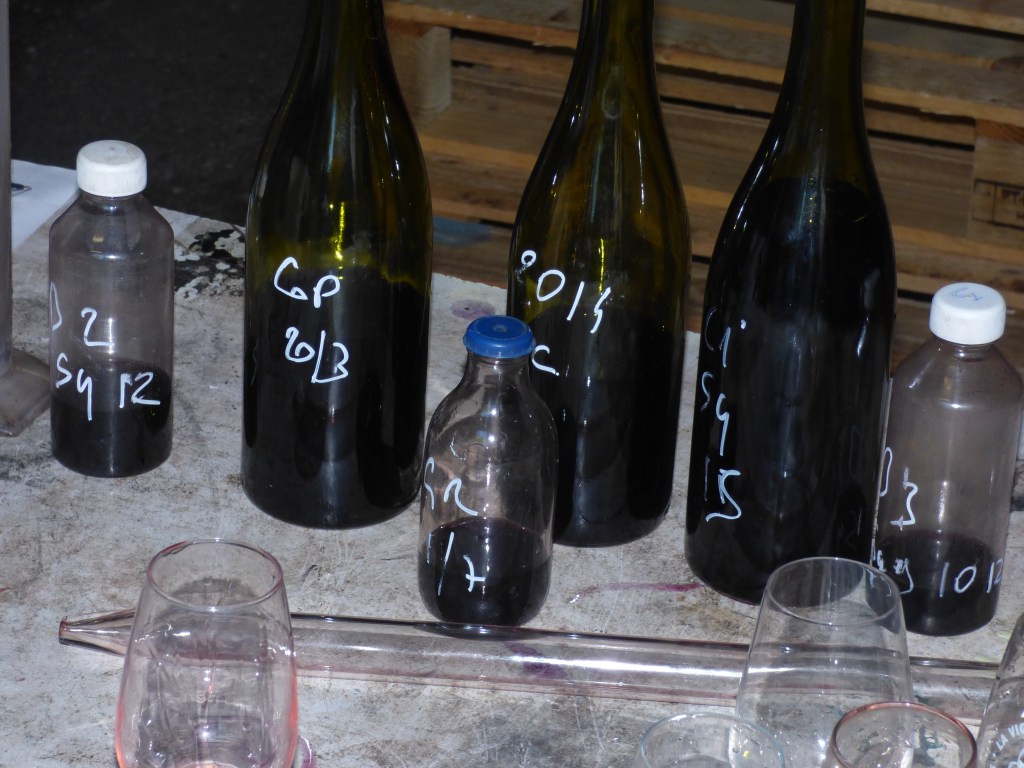 In order to give these blended wines (assemblages) time to truly mix and marry their flavours and textures it is usually in November that Jeff will make the decisions about what to blend. Last week was the right time, fermentations completed, wines maturing. Thierry, his analyst, joined Jeff to try different blendings. They tasted the various wines, then mix together the typical assemblages for the wines, Classe for example will contain Grenache and Syrah. So they tried different percentages mixed and then judge whether the wine would benefit from another component, perhaps some Cinsault for freshness or some Mourvedre for body. Having played around with various blends they agreed upon the final blend.