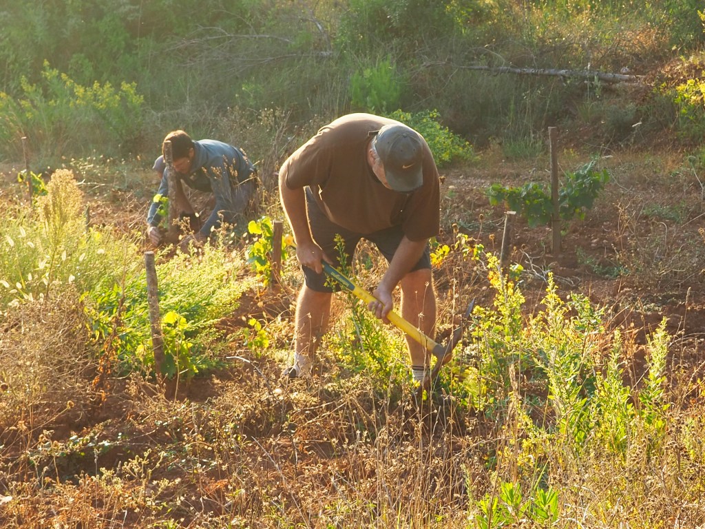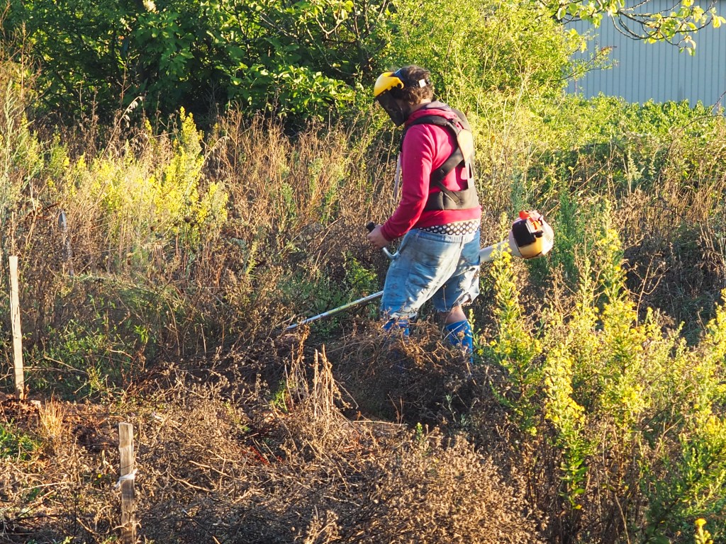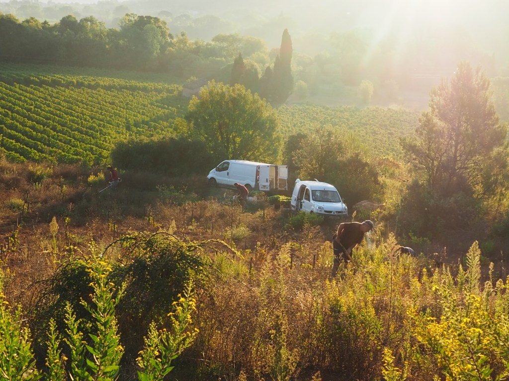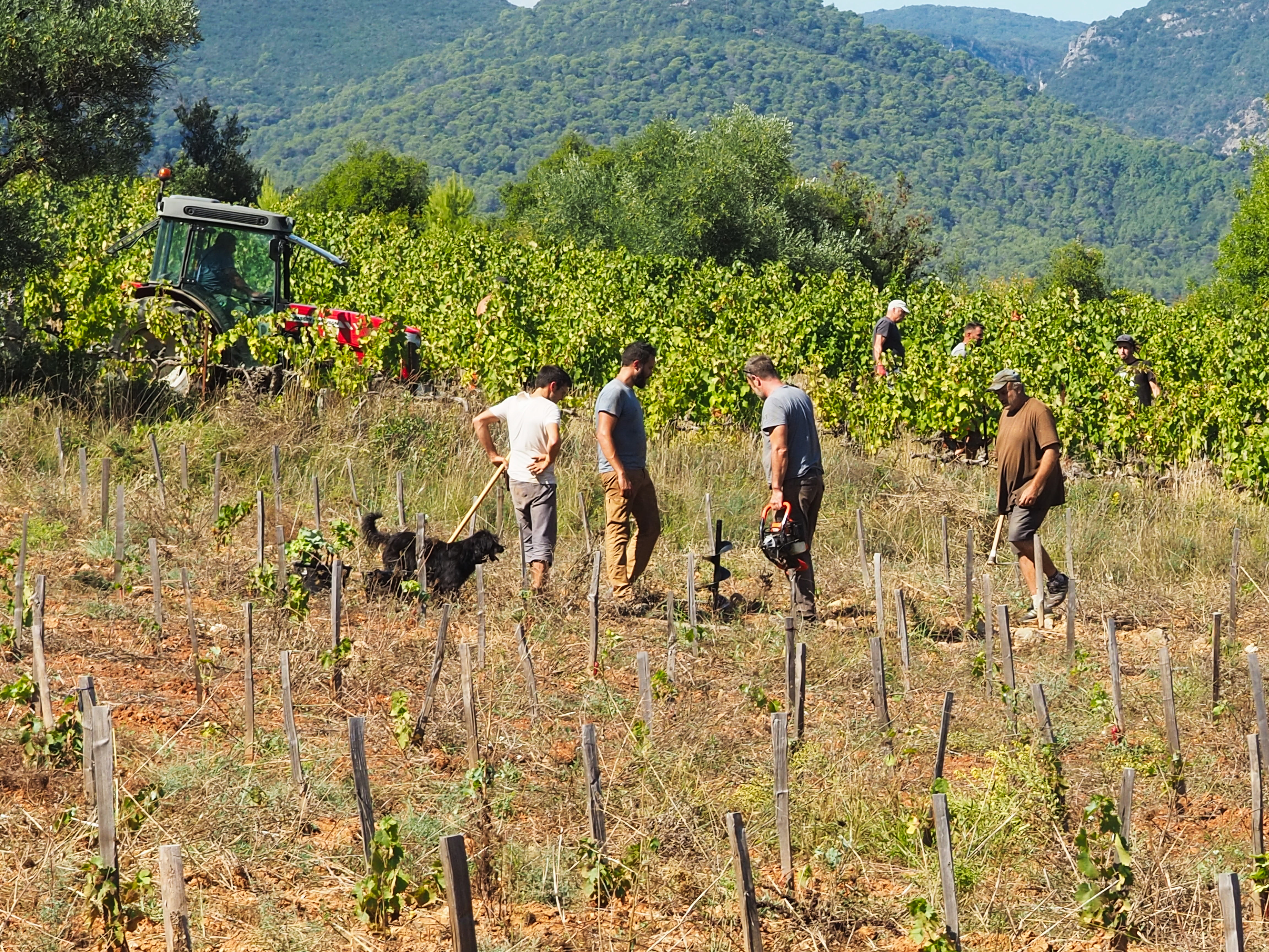 Back in 2019 the vineyard was cleared and planted with some classic Languedoc grapes. However, due to the pandemic the vineyard has not had the attention Jeff would have liked until we went there on September 23rd. A bright, sunny day started off chilly but by mid afternoon we were working at almost 30c temperatures and were in the direct sun. It was hard work. The vineyard had overgrown with weeds, brush. Quite a few of the young vines planted in 2019 had died, as is the norm, and needed to be replaced. A full day’s hot and sweaty work lay ahead.