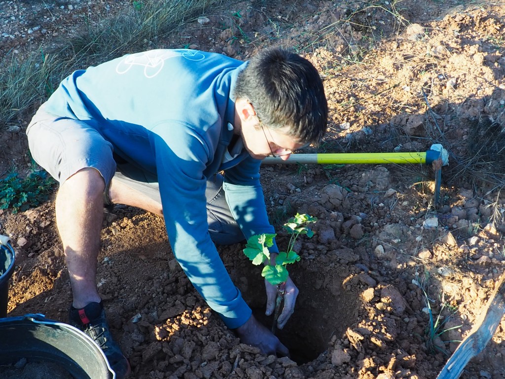 Manu, had rejoined us towards the end of the vendanges and he spent a lot of the morning with Gilles strimming away large clumps of weeds and brush and using a pick and pioche to dig some out. Matteo was hard at work on the drill which was a heavy machine, vibrating heavily as it scooped out the hole which would be used to plant the replacement vines. Steeve, Joffroi and myself busied ourselves mainly with the planting.