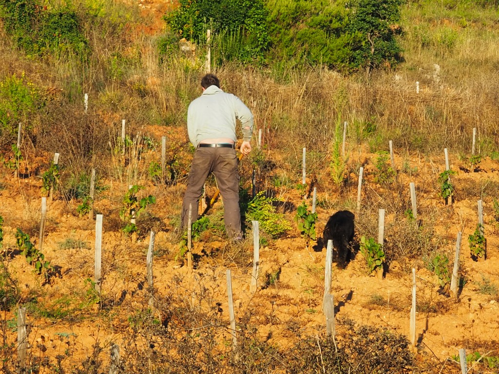We were under strict instructions from Jeff to spread the new plantings around the vineyard and avoid clumps of the same variety, forming a true field blend but also hopefully reducing the risk of disease spreading from one variety to another as some are more resistant to mildew than others. Into the hole went the young vine, organic fertiliser and the hole was refilled. New plants need watering, especially on a hot day like that so Jeff was to and fro with containers. Matteo and Steeve have returned regularly to the vineyard to ensure these tender plants have been watered and are healthy.