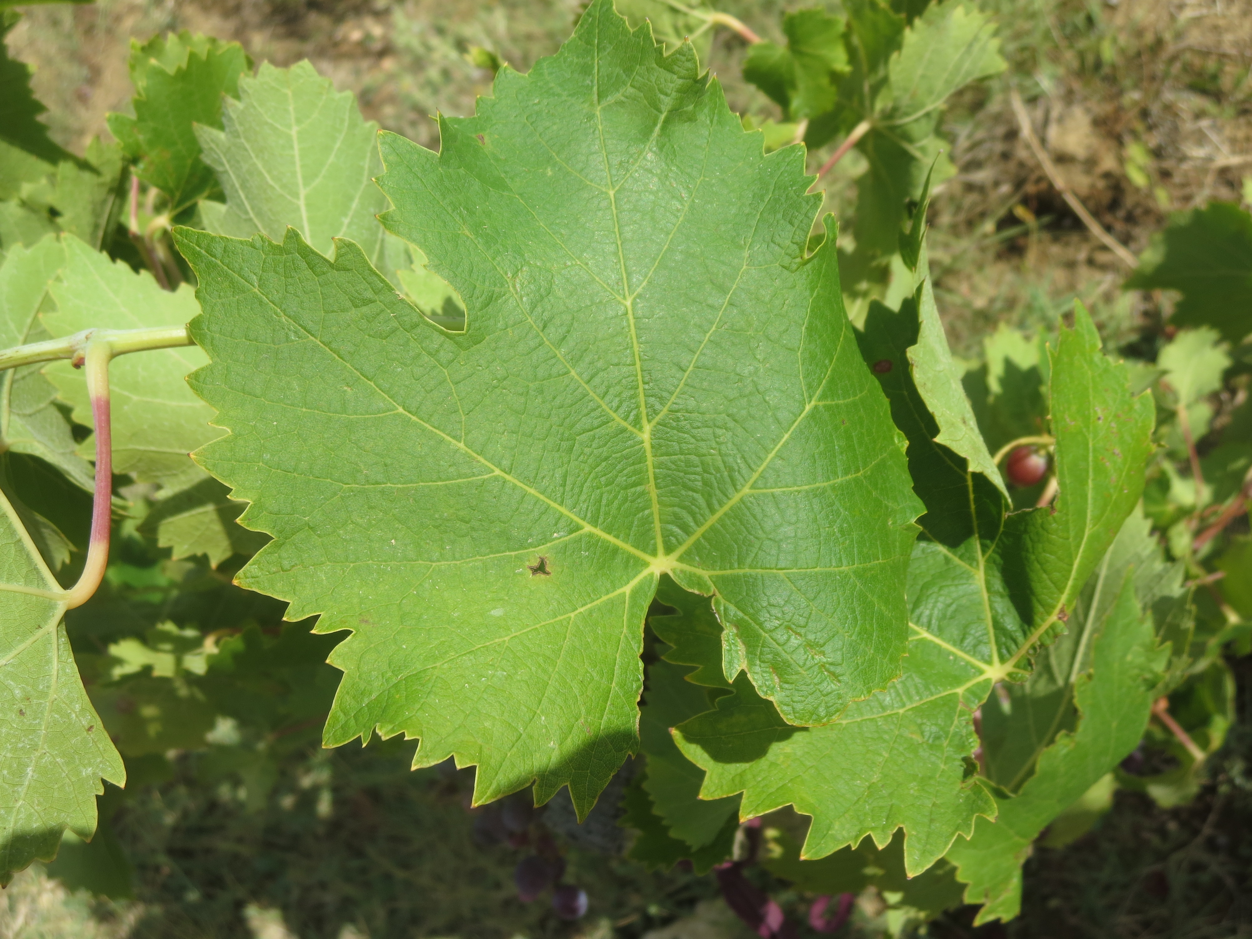 Quite round in shape with 5 lobes and teeth which are sizeable but more round than angular. The veins stand out as they are not coloured, reaching down to the stalk sinus which is often closed or barely open. One distinguishing feature which is observable in the photo is that the leaf tends to curl a little at the edge, note how one lobe is curling under the other on the right of the photo. Small bunches of oblong but small grapes.