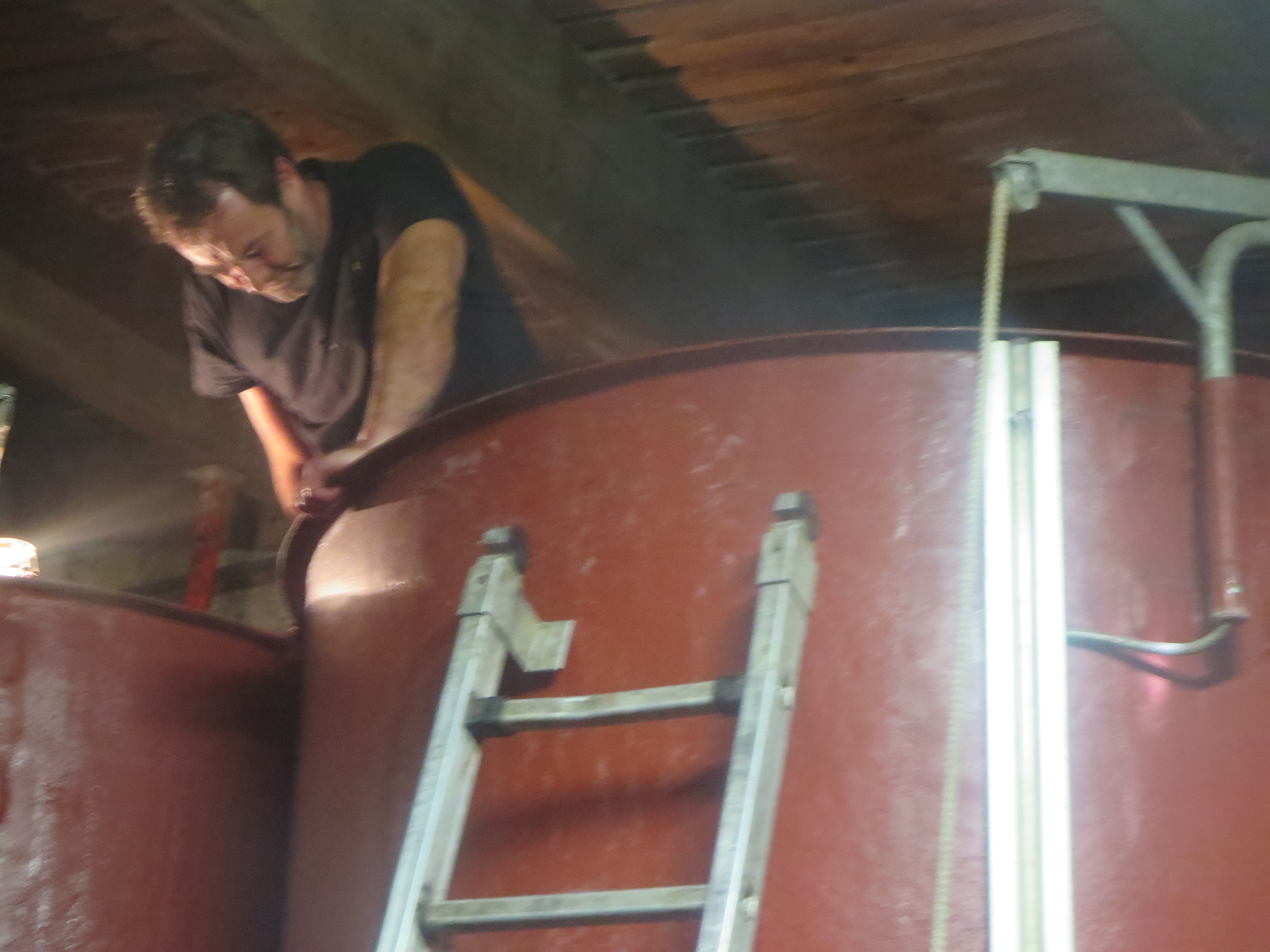 You may recall that this was the tank where Jeff had to improvise last Monday when the érafloir broke down. Some of the bunches were destemmed, others went in whole bunch. There is therefore a higher than usual amount of solid material in the tank. This had formed a solid cap and Jeff needed it to be pushed back into the juice. A fork was used at first as is normal (the process called pigeage), but the crust was too firm. So, Jeff took off his boots and socks and climbed in.