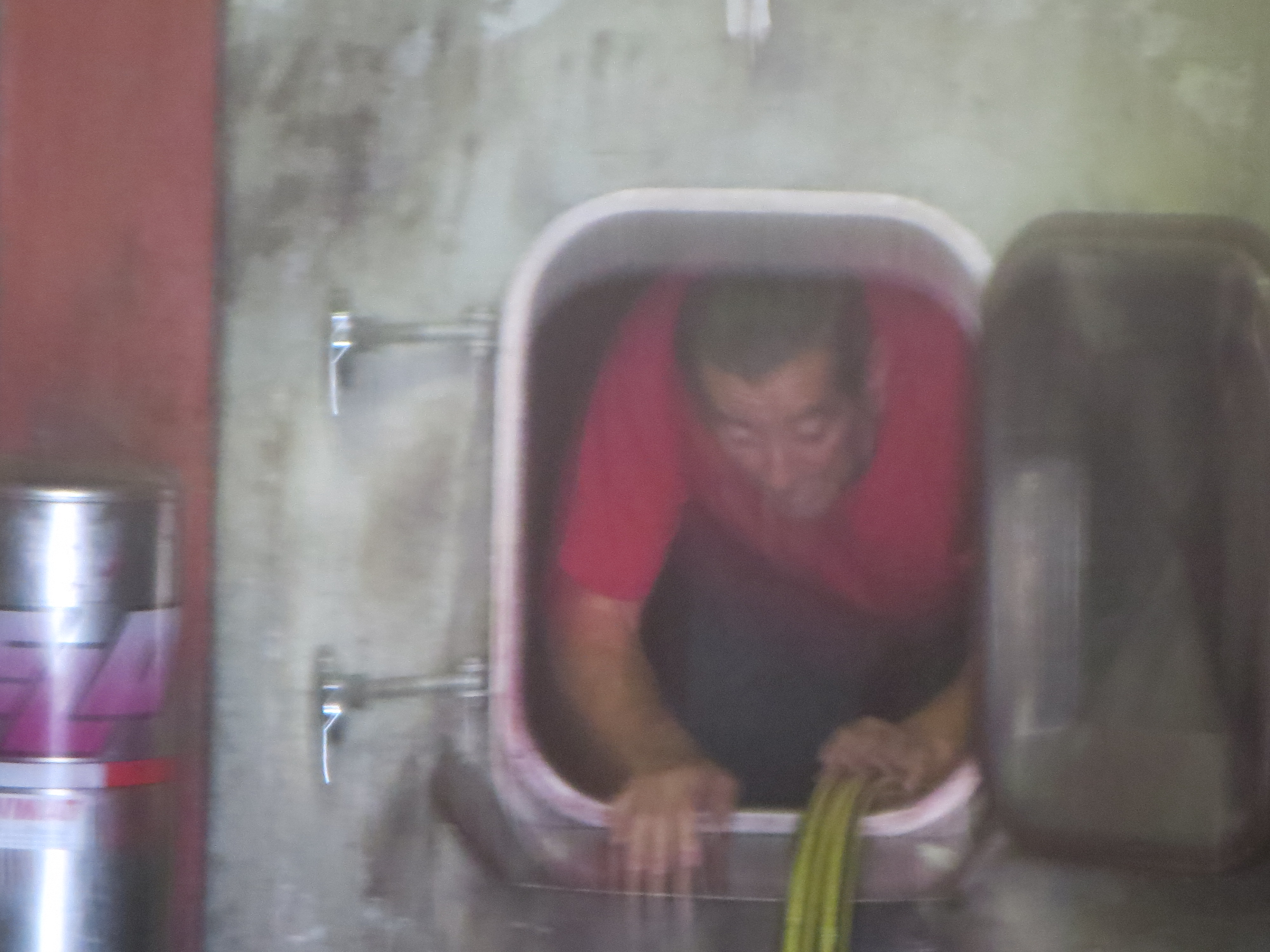 He described the cap as cold but underneath the fermentation meant that the juice was hot. As Jeff pushed down the cap it was fascinating to see the gentle bubbling of the fermentation process, sadly it was too dark for the camera to pick up. As he pushed the cap down, Jeff needed to push lower so, off came the trousers. Moving around the tank the cap began to sink bit by bit.
