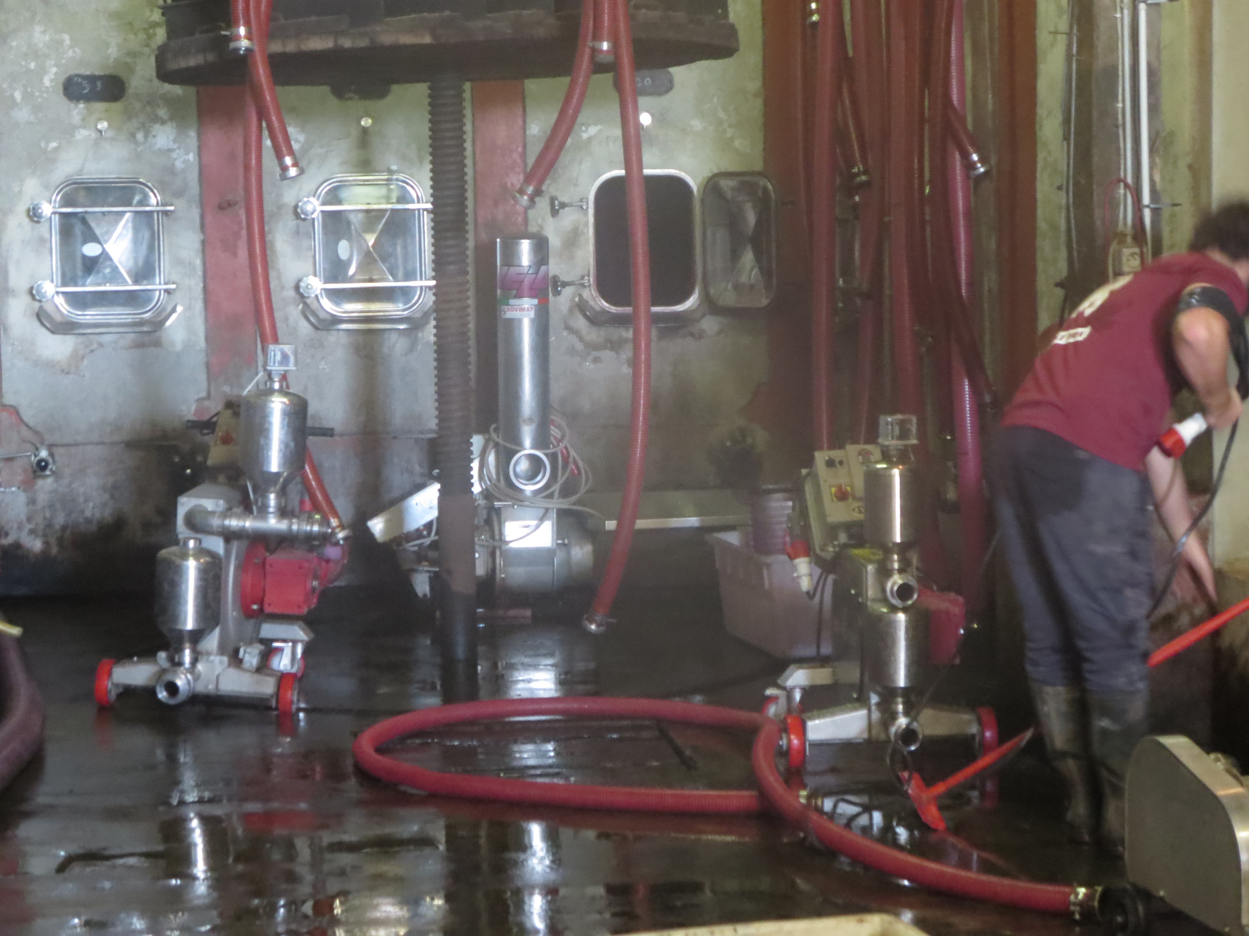 So, on Friday October 2nd the Grenache from Sainte Suzanne which were put into cuve as whole bunches (carbonic maceration) were pumped out and then pressed, a long day of hard work. Pumping juice, lifting out the marc by fork and shovel, pressing the marc, sending the juice to a new tank. This was one day of many, the same processes repeated many times and between each one … lots and lots of cleaning, to reduce any risk of contamination and spoilage.