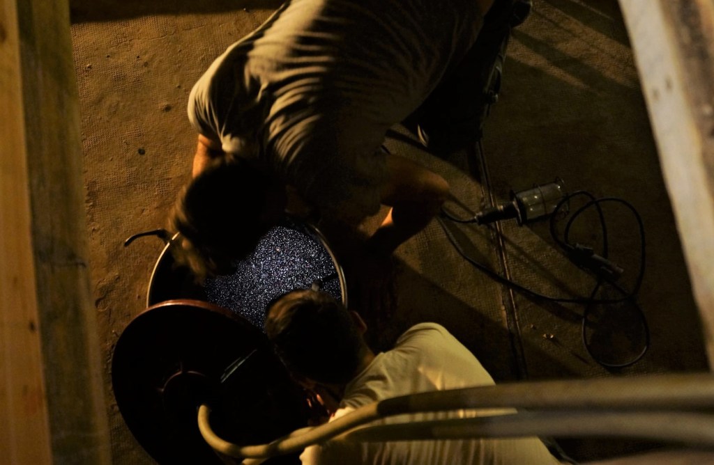 Some fermentations were possibly going too well. This amphora with Muscat has pushed the, very secure, lid off such is the force produced by the process. Pièr is having to do a pigeage to calm things down.