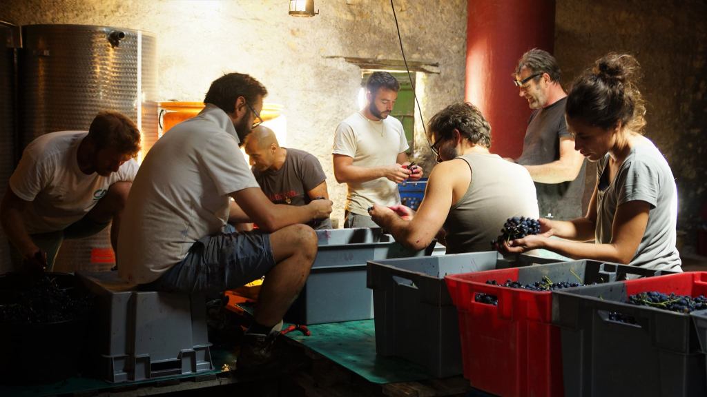 I love this photo showing the team sorting the grapes together, a true image of vendanges teamwork