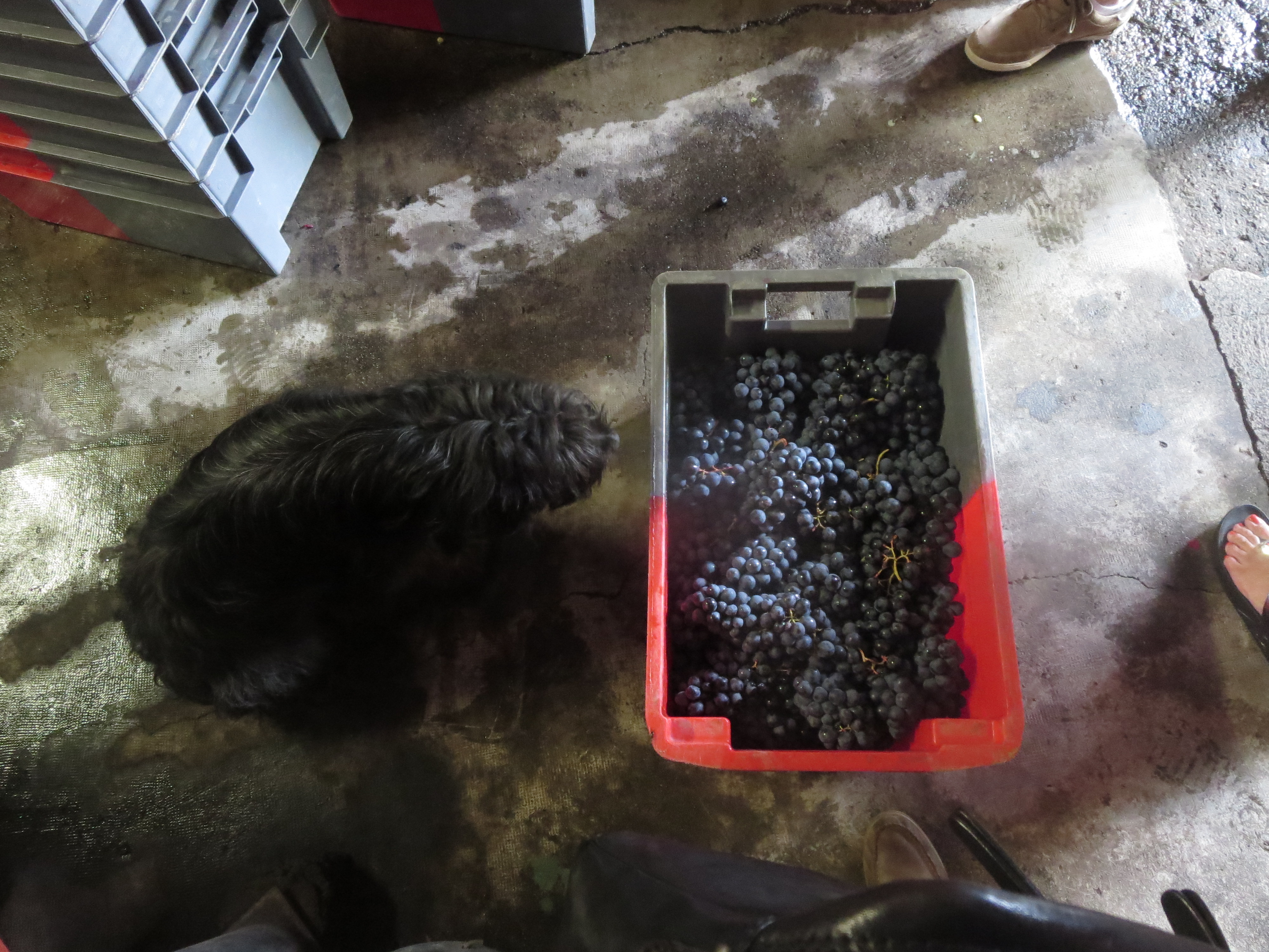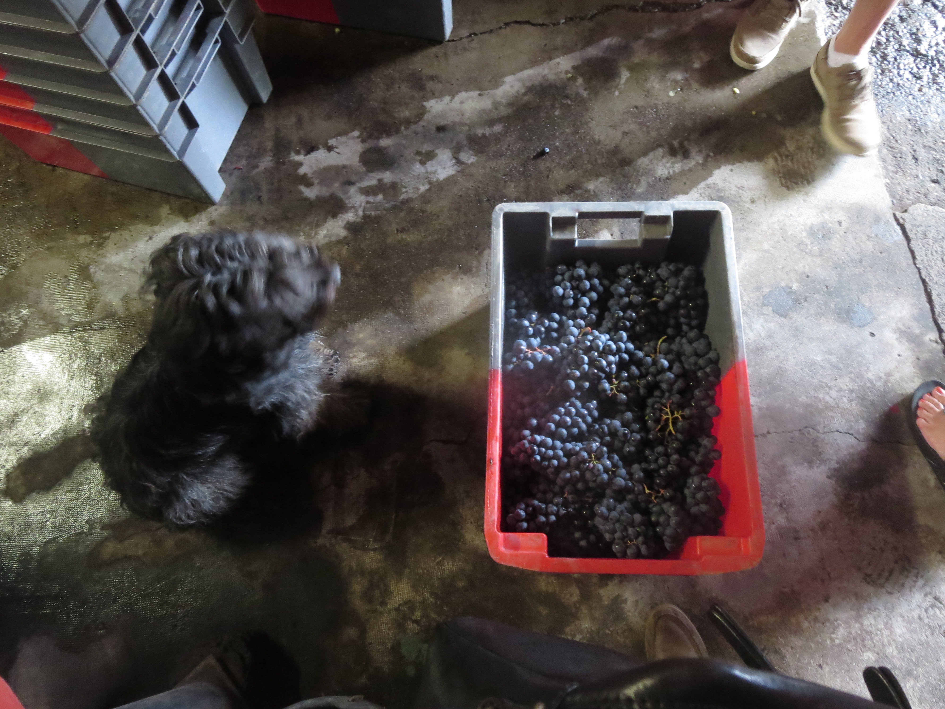 Saturday 29th was a work day for the cellar and the pickers and saw the harvesting of Cinsault grapes from my favourite vineyard, Rome. The grapes were big and juicy though some were uneven and needed more careful sorting. Clearly these were precious grapes as Icare was guarding and watching over them assiduously. The harvest was not as big as many years and so the pickers moved onto Sainte Suzanne again for more Syrah grapes whilst yesterday’s grapes have begun to ferment already.