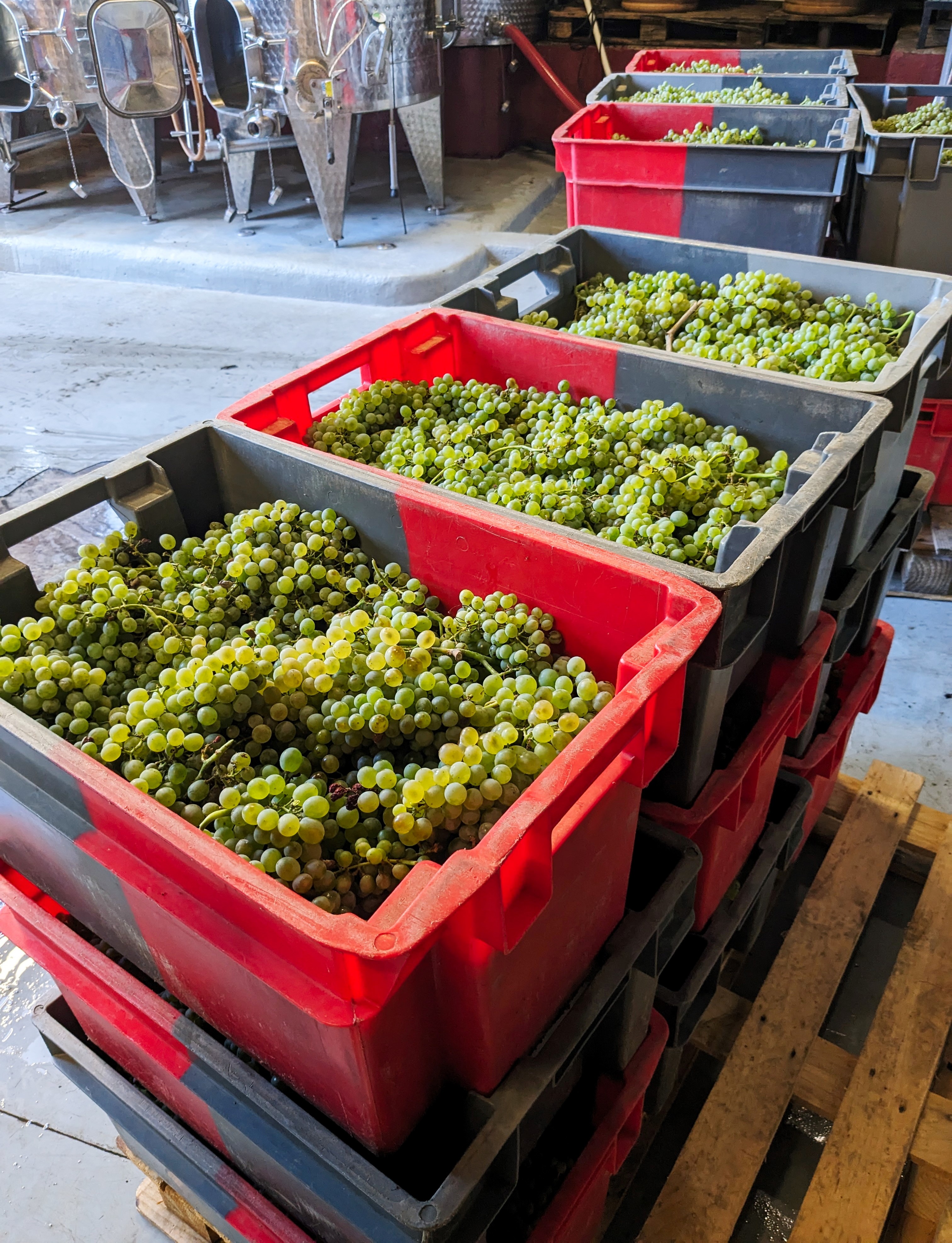 Donc, nous sommes en marche. Mardi est un jour de repos, puis nous reprenons le travail pour le reste de la semaine. Lundi a enregistré des températures allant jusqu’à 39°C, et il devrait faire encore plus chaud mercredi. La récolte a lieu seulement tôt le matin par une telle chaleur, mais même dans la cave, nous avions besoin de grandes quantités d’eau. Ayez une pensée pour nous !