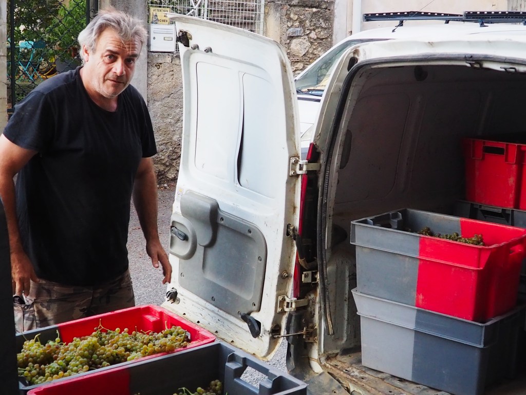 Des raisins gris tels que Riveyrenc, Grenache, Aramon et Clairette Rose. Des variétés rouges comme le Cinsault, l’Oeillade, la Delizia Di Vaprio et le Mourvèdre. Une journée de rêve pour un ampélographe, je me suis bien amusé à regarder à travers les caisses, à essayer de les identifier et, très souvent, à être corrigé par Jeff !