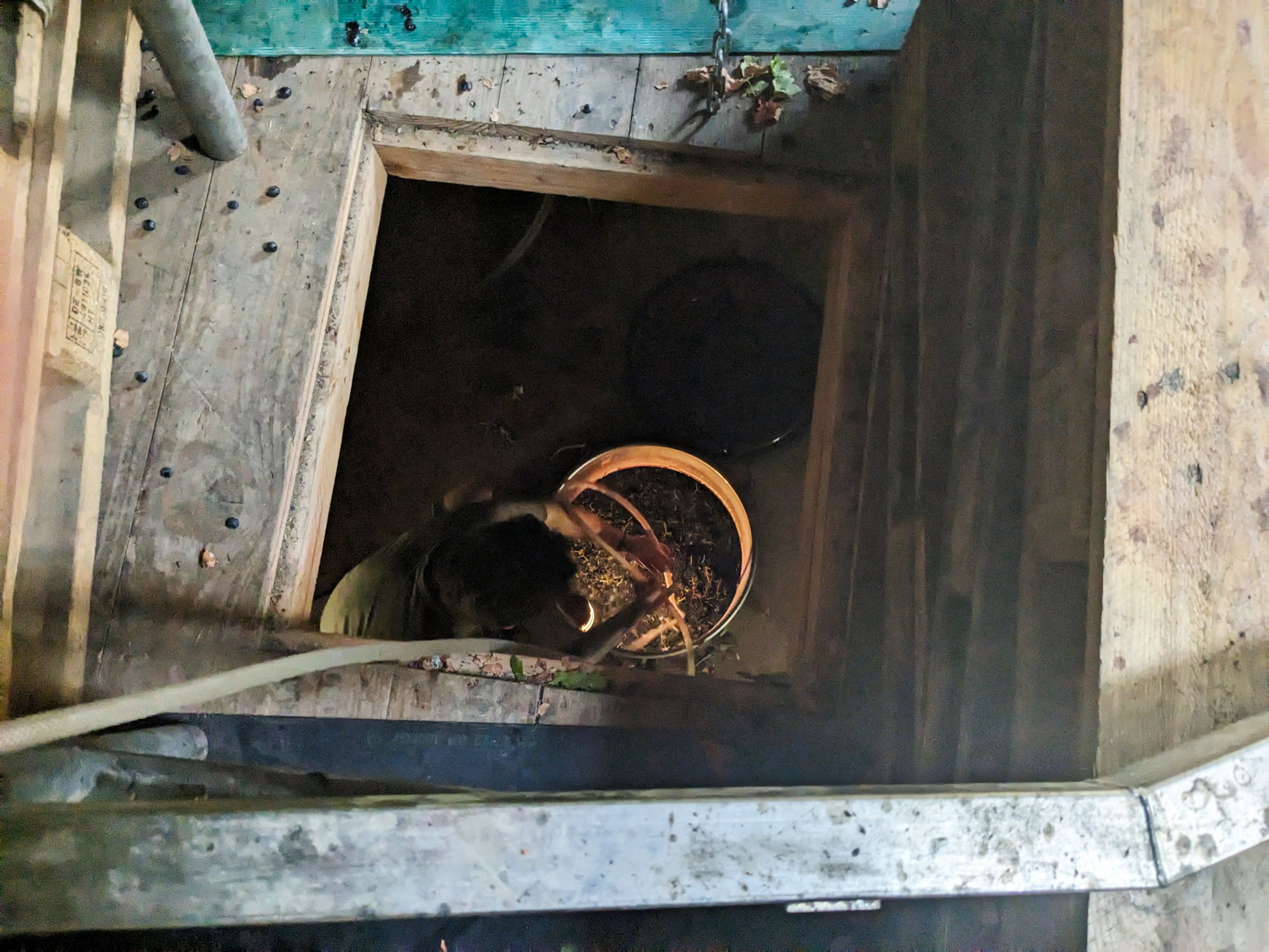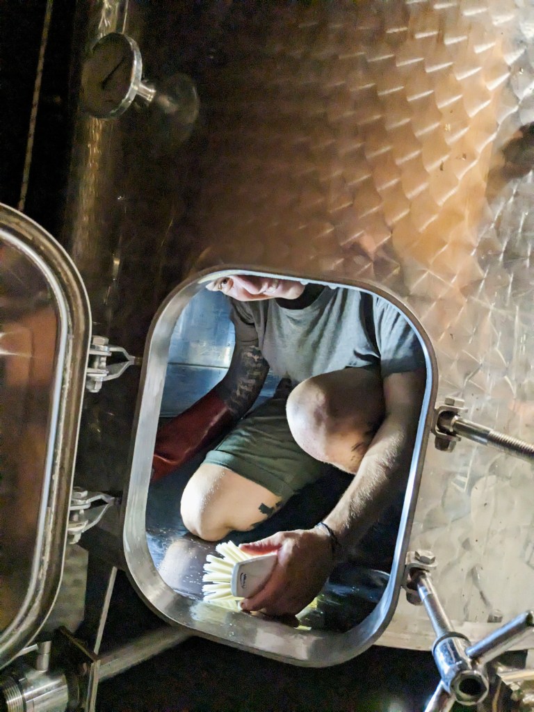 Le jeudi 31 septembre, un changement de rythme s’est produit, passant des grandes productions de raisins à la table de tri à une tâche beaucoup plus chronophage. Les amphores ont fait leur retour au cours de la dernière décennie pour la fermentation des raisins. Jeff en a acquis quelques-unes en 2017 et depuis, sa collection s’est agrandie. Malheureusement, l’une des amphores s’est fissurée la semaine dernière, probablement en raison d’une fissure non remarquée, car elle était remplie d’eau. L’eau sert à assurer un nettoyage complet de l’amphore. L’une des nouvelles amphores conservait encore des résidus de vin de l’année précédente, l’argile poreuse retenant une partie du jus. Remplir l’amphore d’eau, renouvelée quotidiennement, aide à éliminer tout résidu.