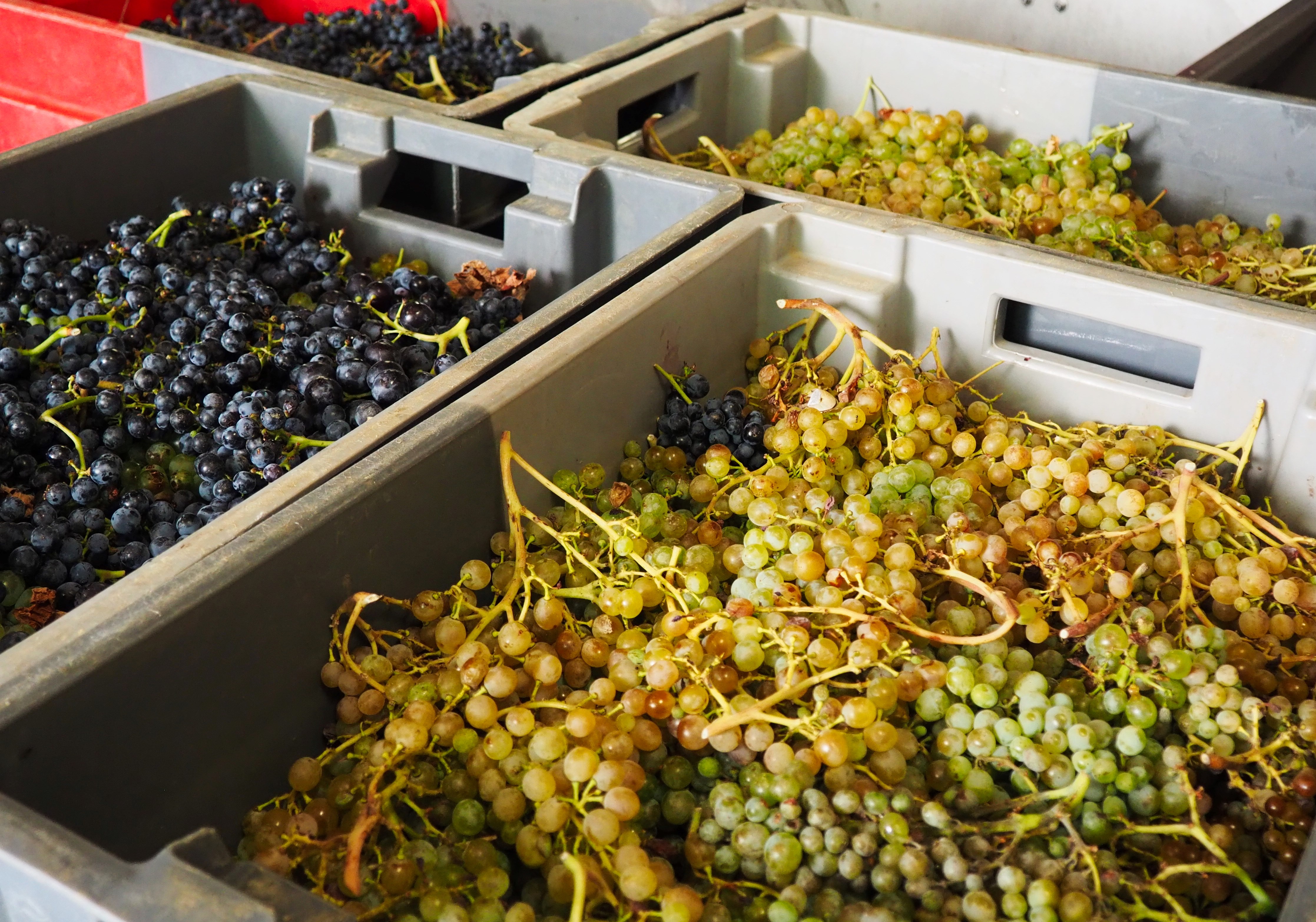 Heureusement, Jeff a pris la décision juste. Bien qu’il y ait eu quelques grappes affectées, nous avons pu les traiter à la table de tri. Le Cinsault était d’une qualité aussi bonne que je m’en souvienne, et la taille des grappes et des raisins faisait en sorte que les caisses nous parvenaient rapidement depuis le vignoble. De plus, du Mauzac et de l’Aramon Gris sont arrivés, tous deux ont dû être examinés pour de petites quantités d’oïdium – la première maladie de la récolte, mais heureusement, elle n’affectait qu’un faible pourcentage des raisins. Les raisins les plus frappants étaient cependant les Aramon Noir, les tiges contrastant joliment avec les raisins très noirs en très bonne santé. L’Aramon était bien sûr largement planté dans la région et utilisé pour produire d’énormes quantités de vin bon marché à faible teneur en alcool. La grande majorité a été arrachée, mais il y a eu une renaissance récente avec des producteurs comme Jeff visant de faibles rendements en raisins fruités. L’assemblage de ces raisins donnera naissance à Ploutelou, la troisième cuvée de ce type, un hommage de Coutelou au Ploussard du Jura, qui lui-même a une peau fine et sombre produisant un vin plutôt léger et fruité. Ploutelou a remporté un grand succès et celui de cette année devrait être excellent.