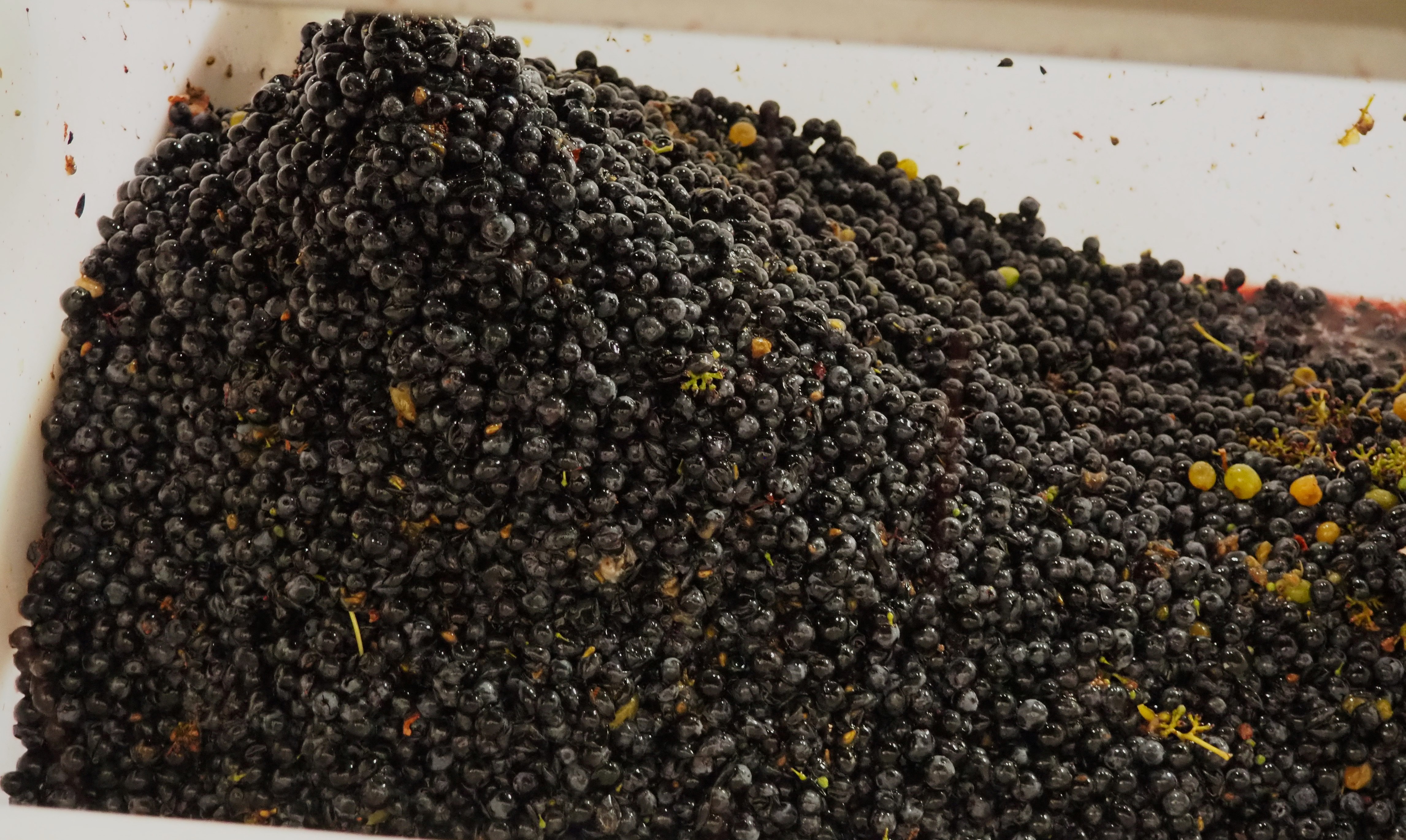 Les raisins sont en très bonne santé, la sécheresse a au moins empêché tout mildiou ou oïdium. Le tri des raisins rouges a été simple, principalement en enlevant les feuilles et les escargots. Les escargots ont clairement cherché toute humidité dans le paysage desséché et se sont accrochés aux raisins par désespoir. Après éraflage, les raisins ont été triés une deuxième fois pour éliminer les rafles ou les feuilles qui avaient réussi à passer. Ils ont ensuite été placés dans de petites cuves en acier inoxydable, trois cuves ont été remplies et Jeff était raisonnablement satisfait de la quantité, des rendements assez typiques malgré la petite taille des raisins.
