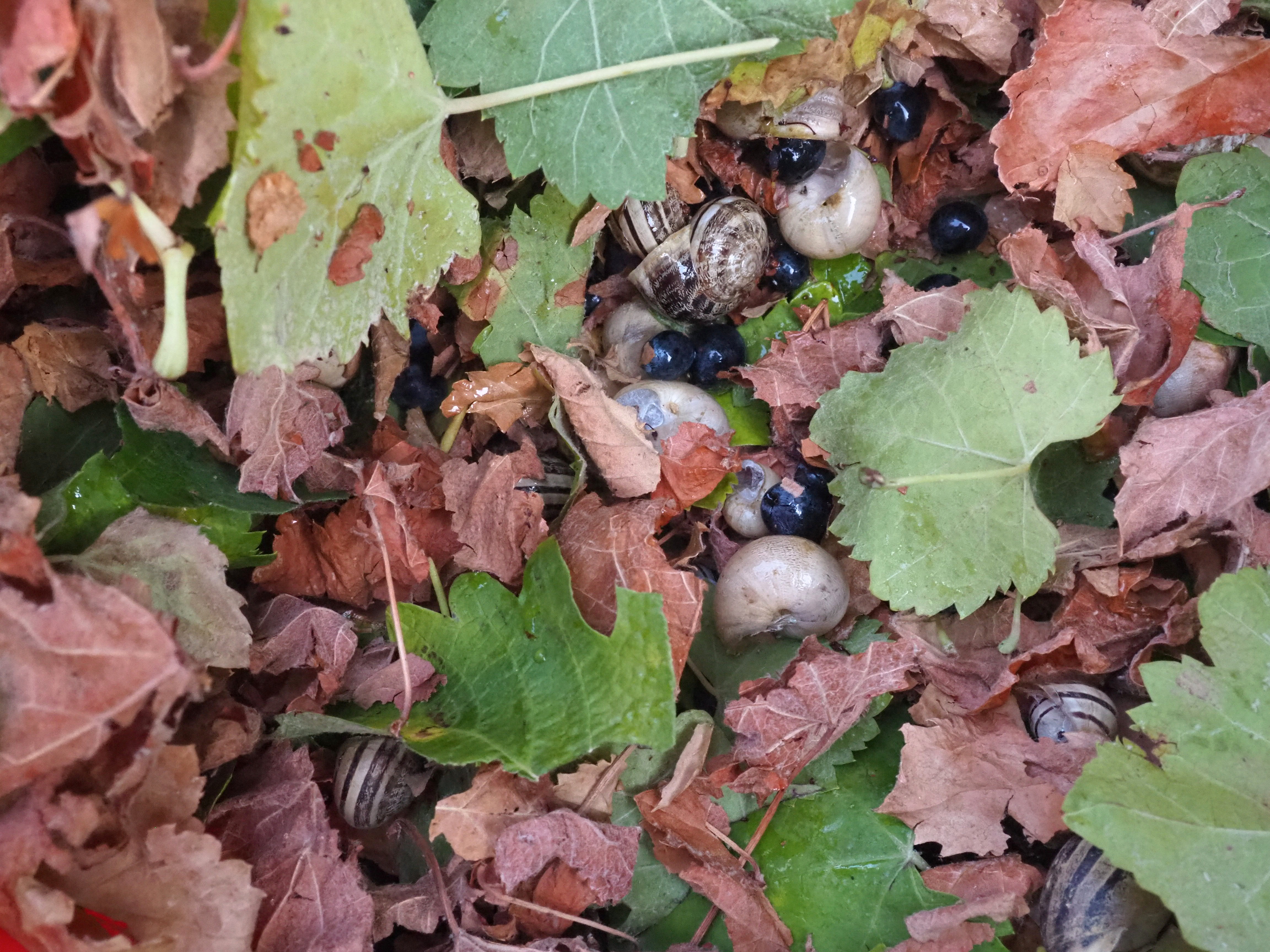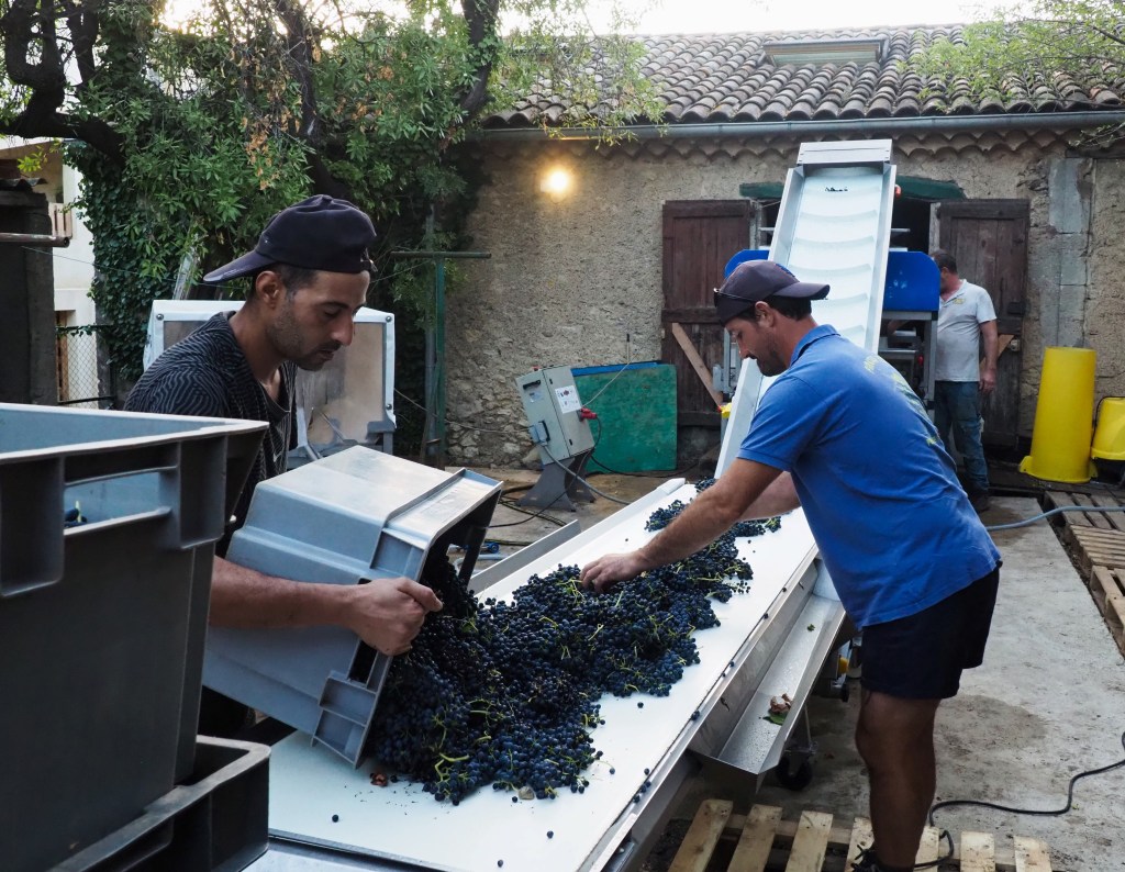 Ensuite, nous sommes passés au Syrah de Sainte Suzanne, qui fait généralement partie du Vin Des Amis. Bien que plus connu pour les vins de la vallée du Rhône comme la Côte-Rôtie ou le Shiraz de la Barossa Valley, l’expérience ici dans le Languedoc montre que le Syrah n’aime pas trop le soleil et la chaleur. Bien sûr, dans le sud de la France, il est habitué aux deux, mais c’est une question d’équilibre. Les raisins de Ste Suzanne étaient petits, manquant bien sûr d’humidité. Néanmoins, ils étaient en bon état, exempts de maladies, et à la table de tri, nous n’avons dû enlever que des escargots et des feuilles.