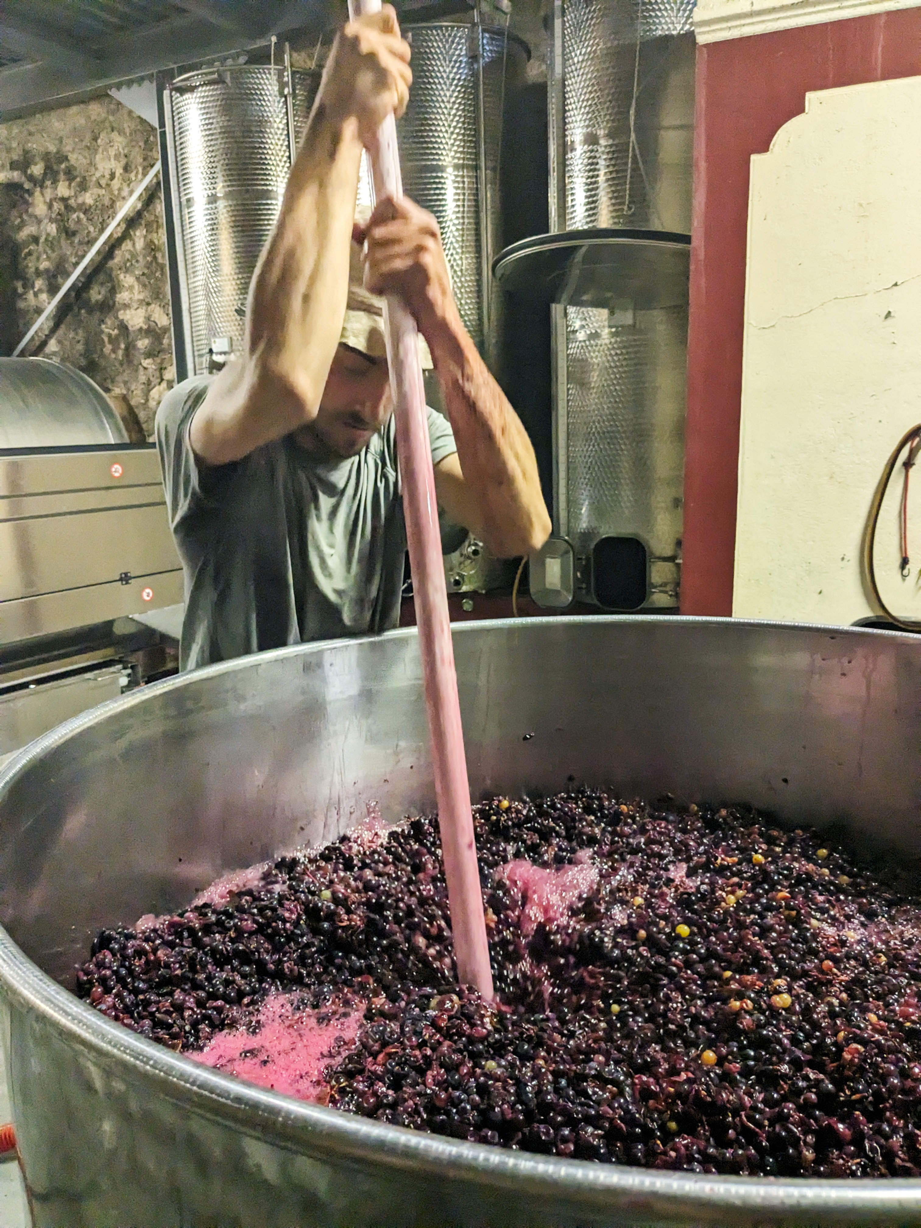 Mercredi et jeudi ont vu les vendanges et l’équipe entrer en plein essor après l’essai de pratique de lundi. Eh bien, c’était le plan et cela s’est principalement passé comme ça, mais la technologie nous a laissé tomber. Ce n’est pas la fin du monde, mais les jours où les températures ont atteint 42 °C, il n’était pas utile de devoir s’adapter à des adversités imprévues. Néanmoins, nous avons lutté et rempli de grands réservoirs de beaucoup de raisins. Enfin, du Syrah (et un peu de Clairette). La bonne nouvelle était le retour de Boris, qui fait partie des vendanges depuis les cinq dernières années.